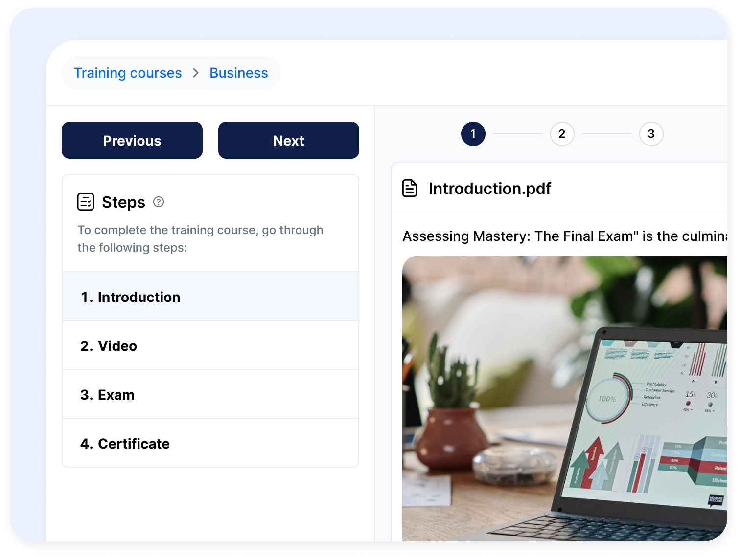 Automated employee training and onboarding through step-by-step multimedia lessons with tests.
