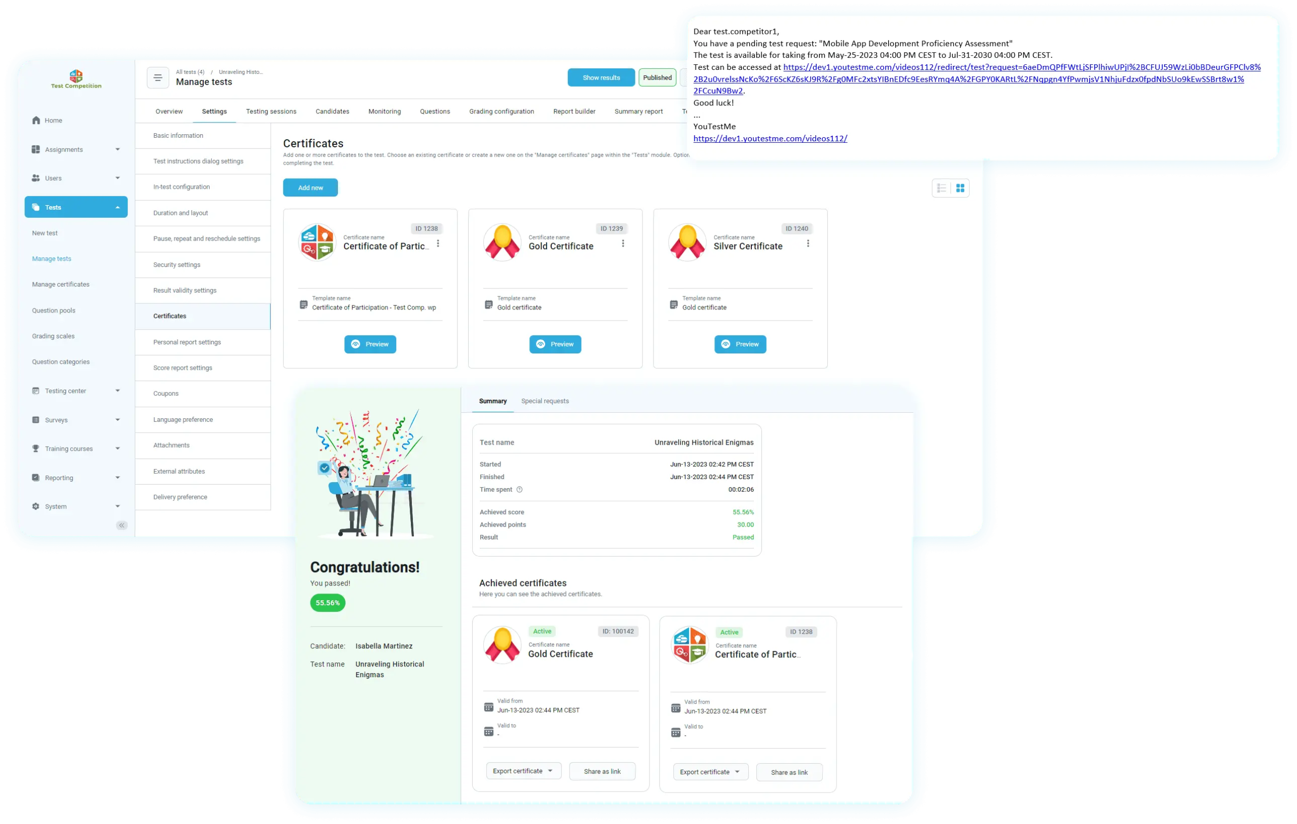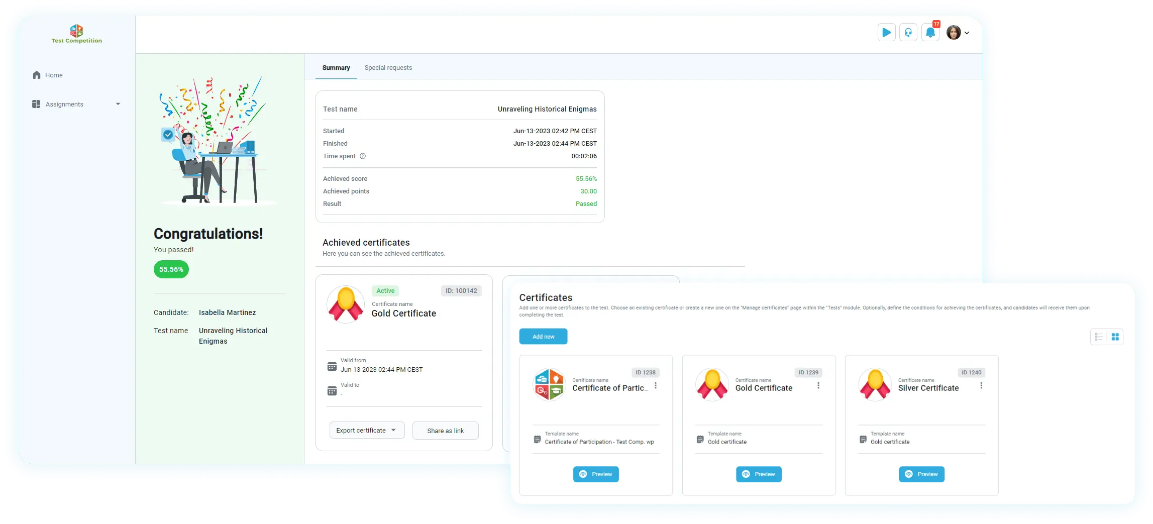 Award certificates to users who participate in competitions. These certificates can be customized and branded. Additionally, you may define conditions for giving out particular certificates. This means you can award different certificates based on the achieved score.