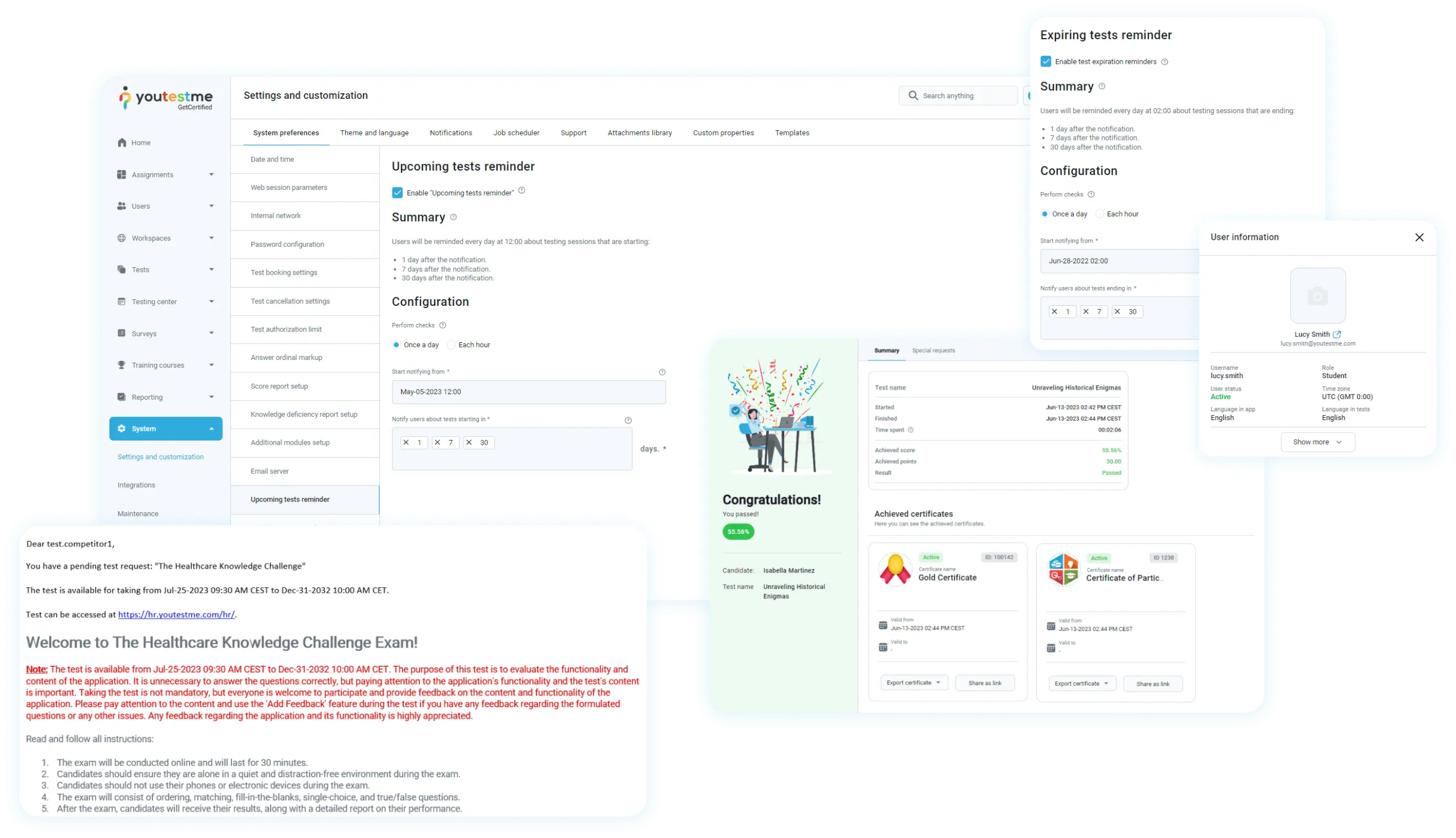 Automated notifications inform candidates of their assignment to tests. Schedule automated reminders to be sent at specific intervals, reminding candidates to participate in certification exams. You can customize these notifications, add instructional materials in different formats, and include direct links. These links redirect candidates to the exam with or without requiring log in.