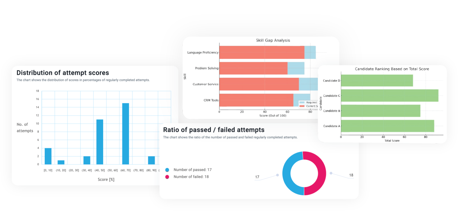 Generate detailed performance reports that highlight skill gaps, rankings, and score comparisons, providing a comprehensive view of individual and group performance. These tailored reports help identify areas for improvement and ensure data-driven decisions in hiring and training.
