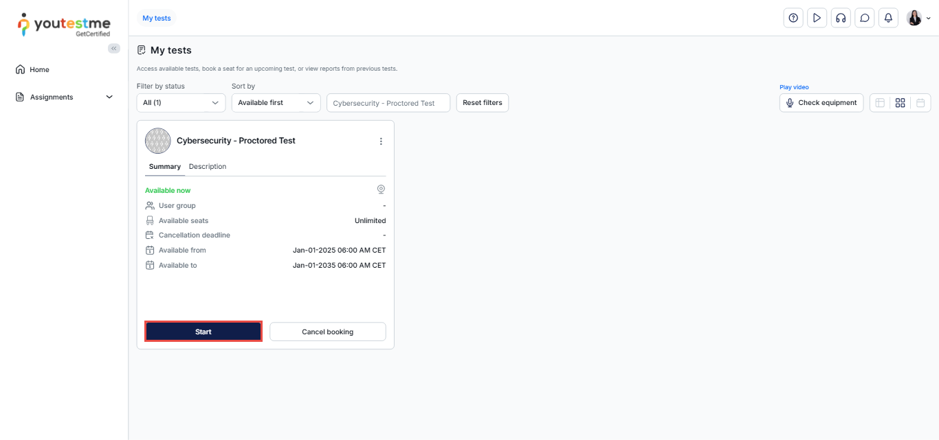 After logging in, you will be automatically redirected to the My Tests page, where you can use the search bar to find the desired exam and then click the Start button.