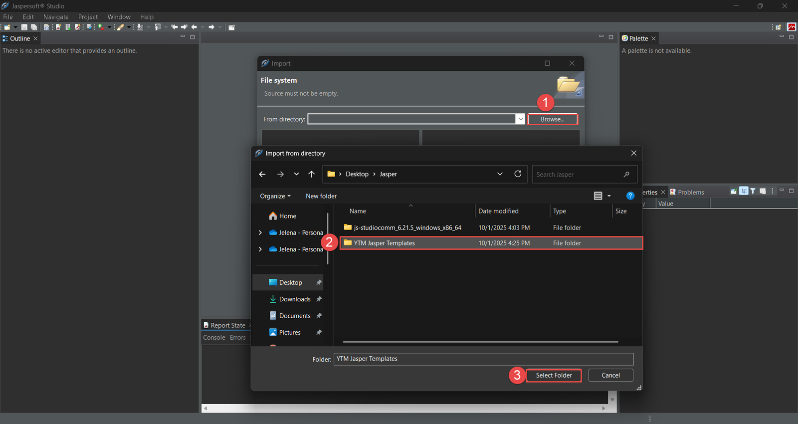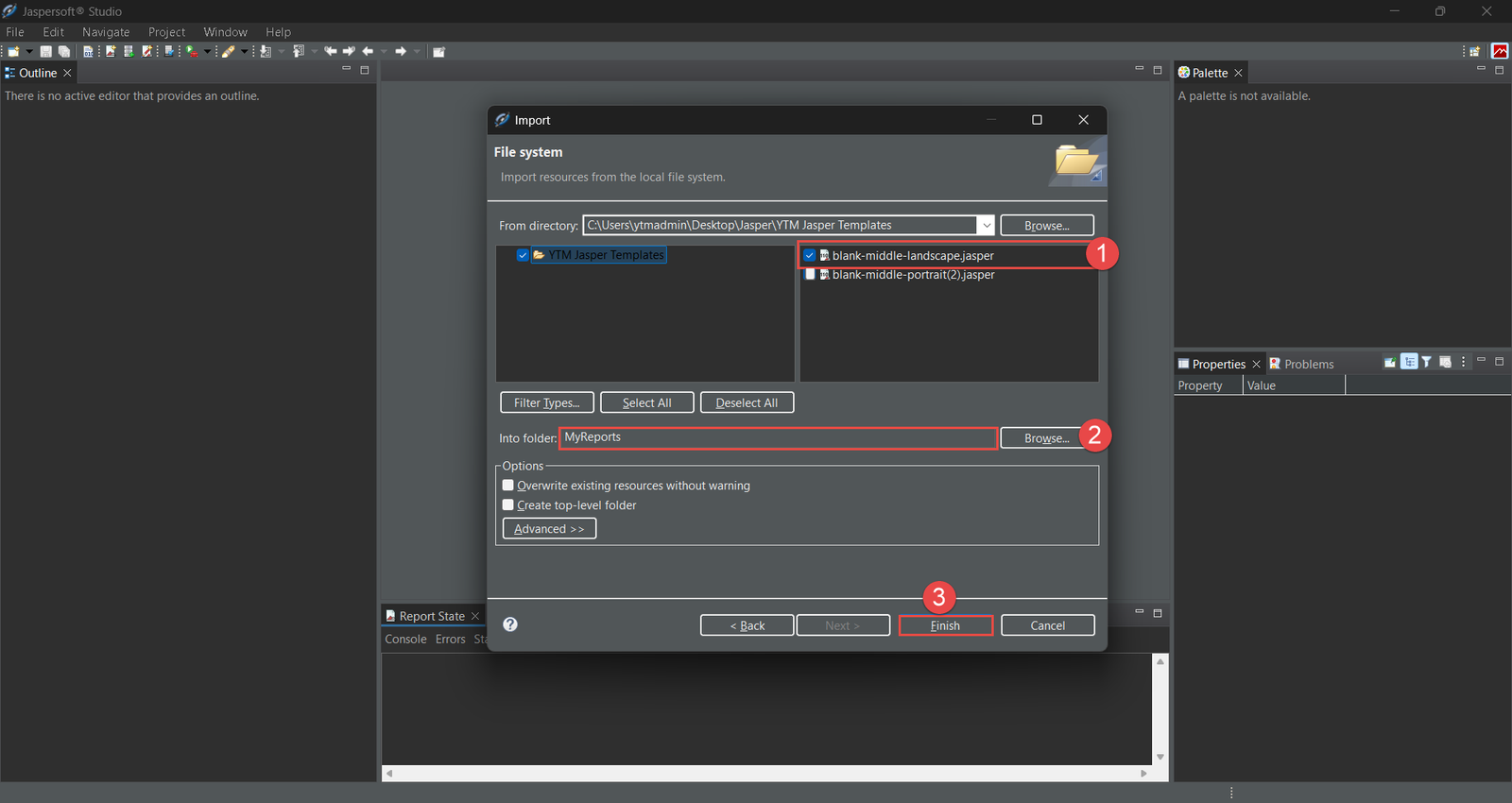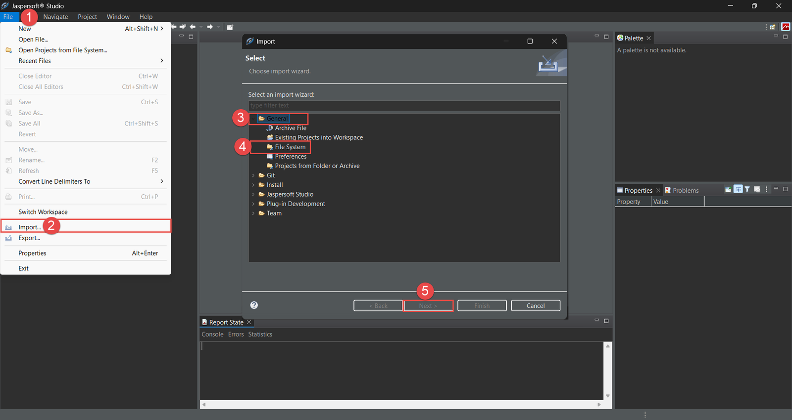 Start by importing the default templates into your project in JasperSoft Studio. The steps are shown in the figures below: