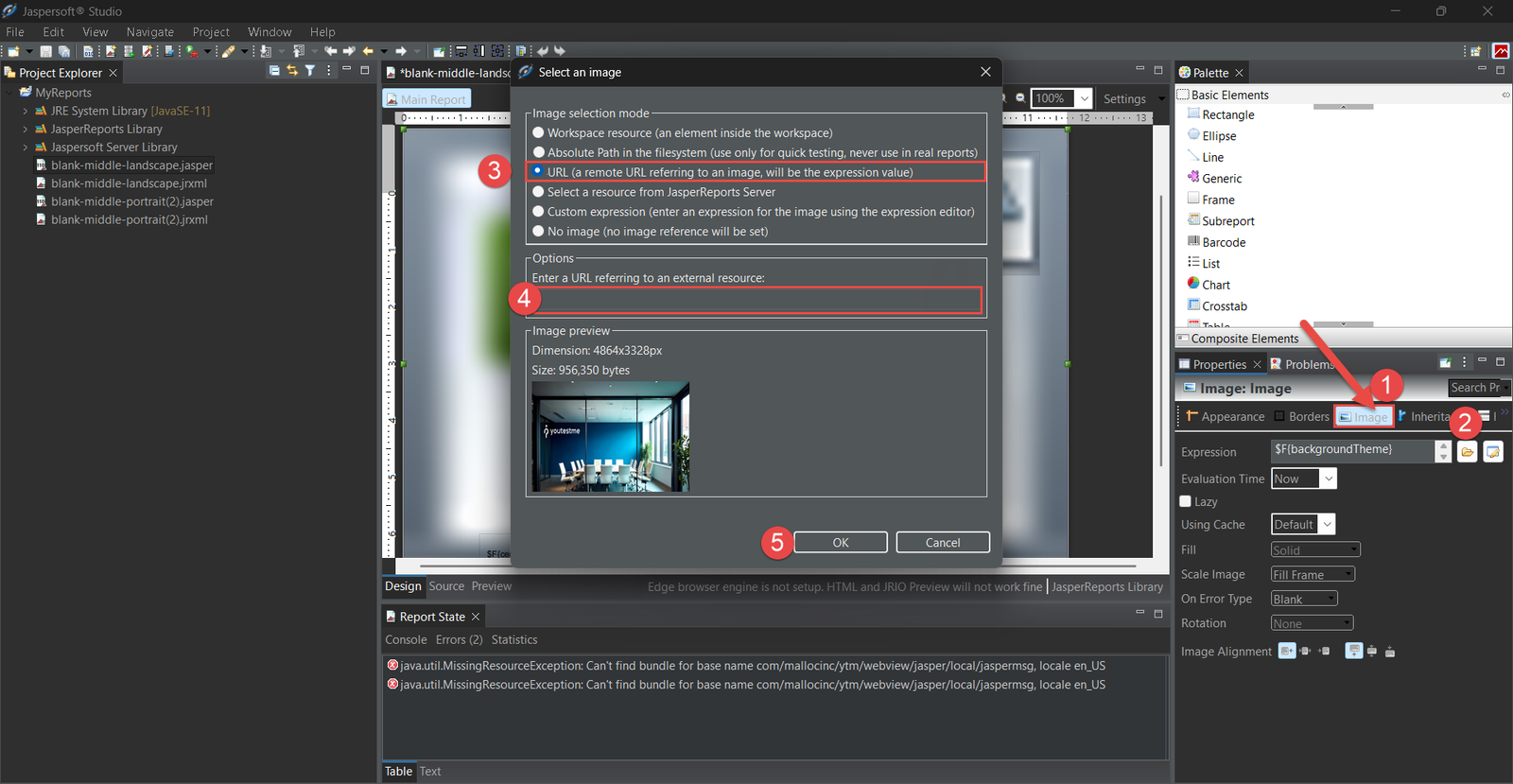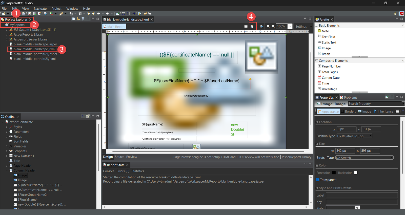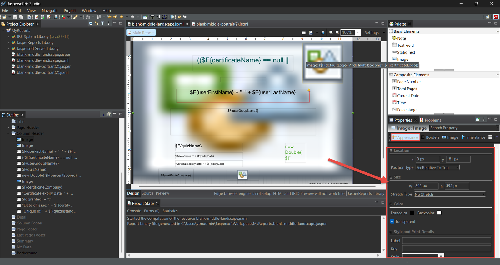 First, we import the image from the file system into the template to place other elements in the desired positions concerning the background. The steps are shown in the figure below. We are changing the properties of the image element representing the background image in the template.