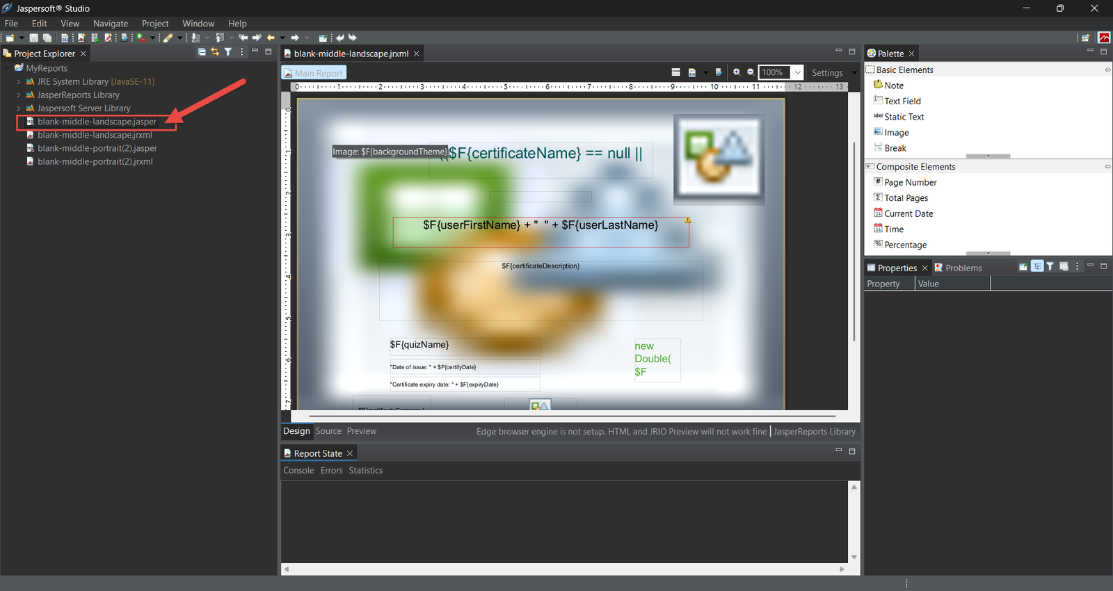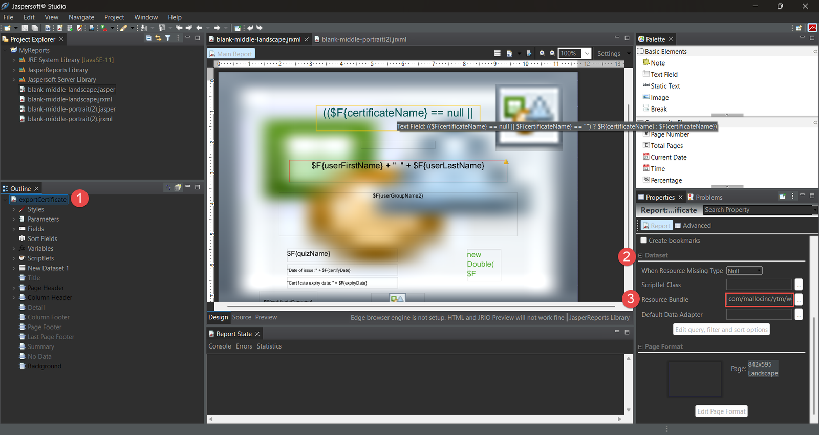 The figure below shows that the template elements are placed in a Detail band, and when exportCertificate on the top of the Outline window is clicked, we can see the properties of the entire report on the right. By clicking the Edit Page Format button, a dialog appears where you can modify page size, orientation, margins, etc. After this operation, make sure the Language property is set to “Java” (sometimes it changes by itself after changing the page size).
