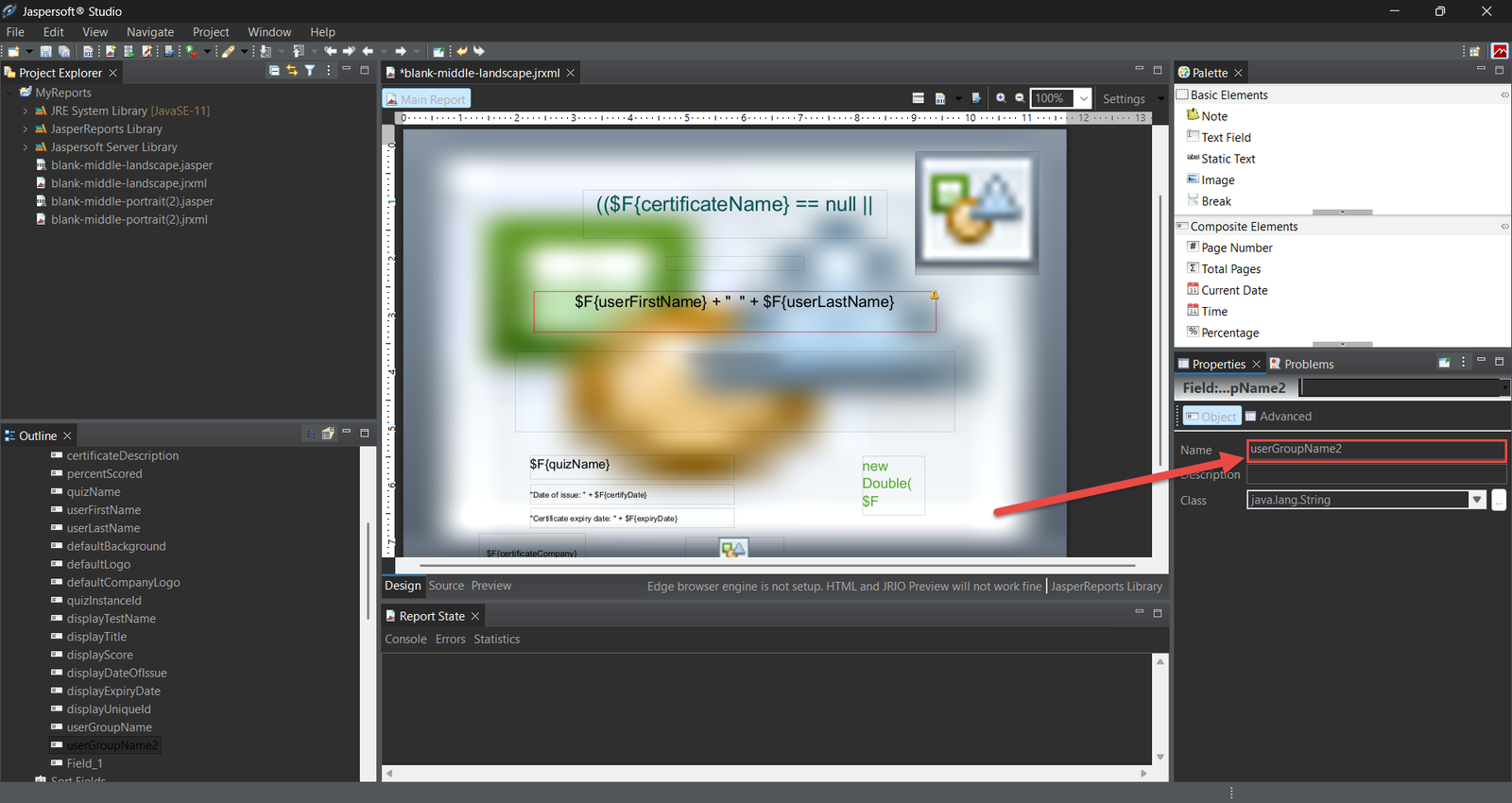 If there are syntax errors in the code, the report will not compile. Check the error messages shown in the Report State section and correct them. - During certificate template upload to the YTM application