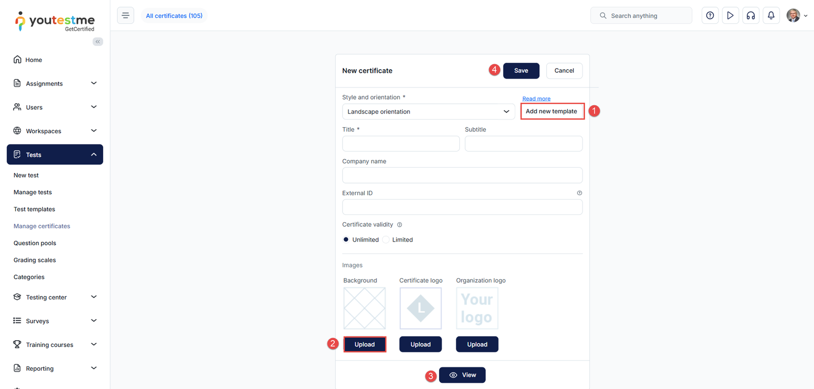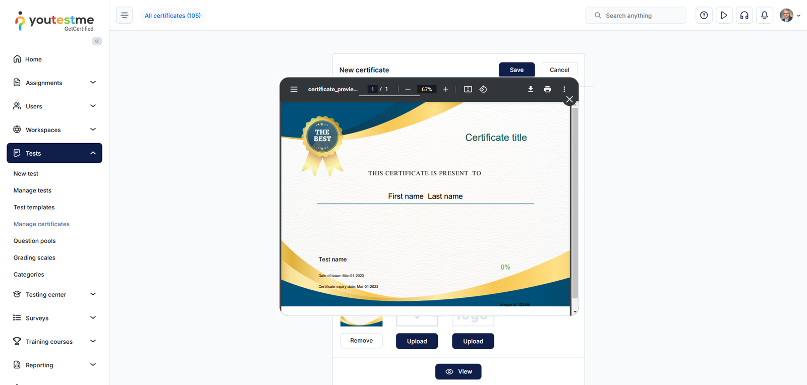 After adding the template, create a certificate from the Tests/Manage certificates tab: