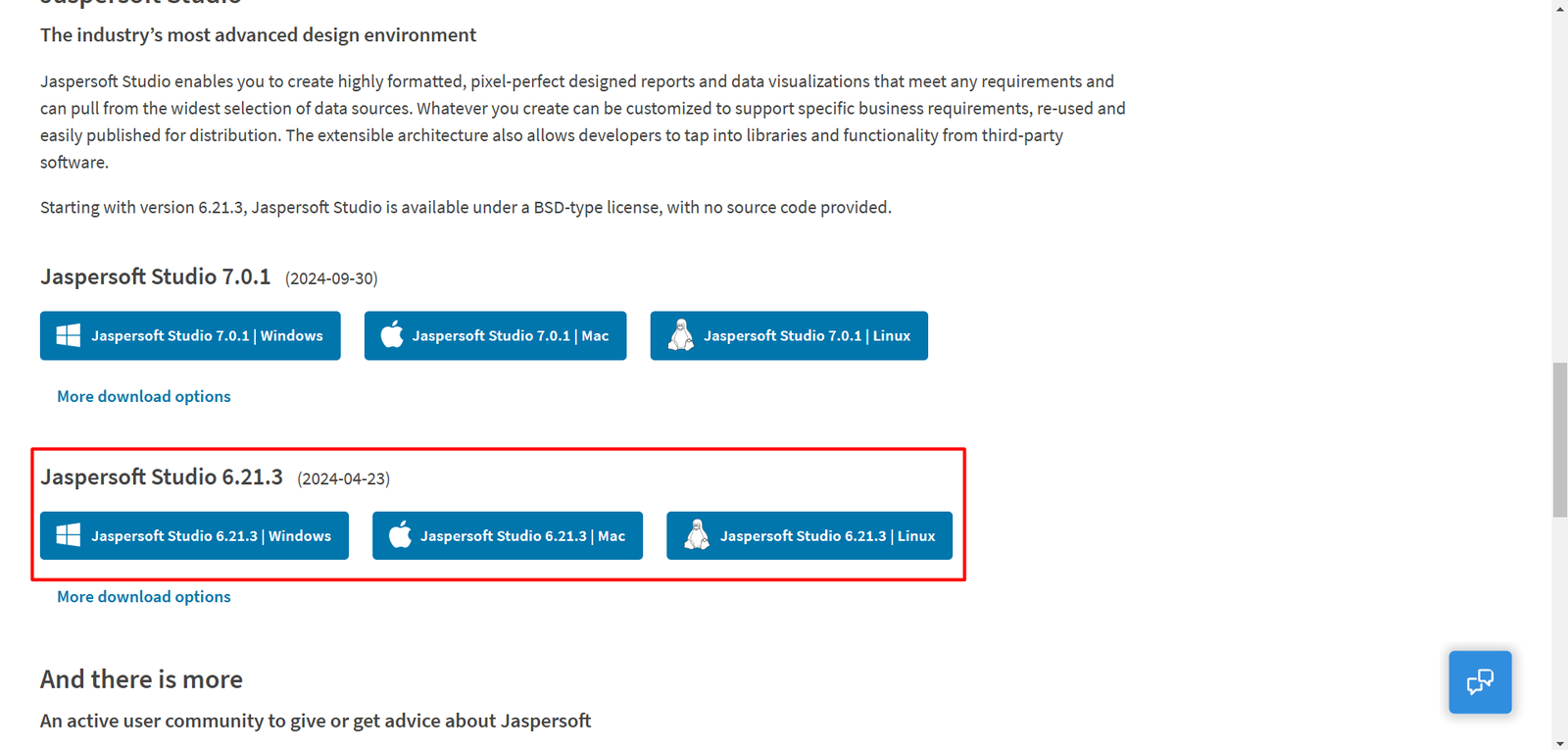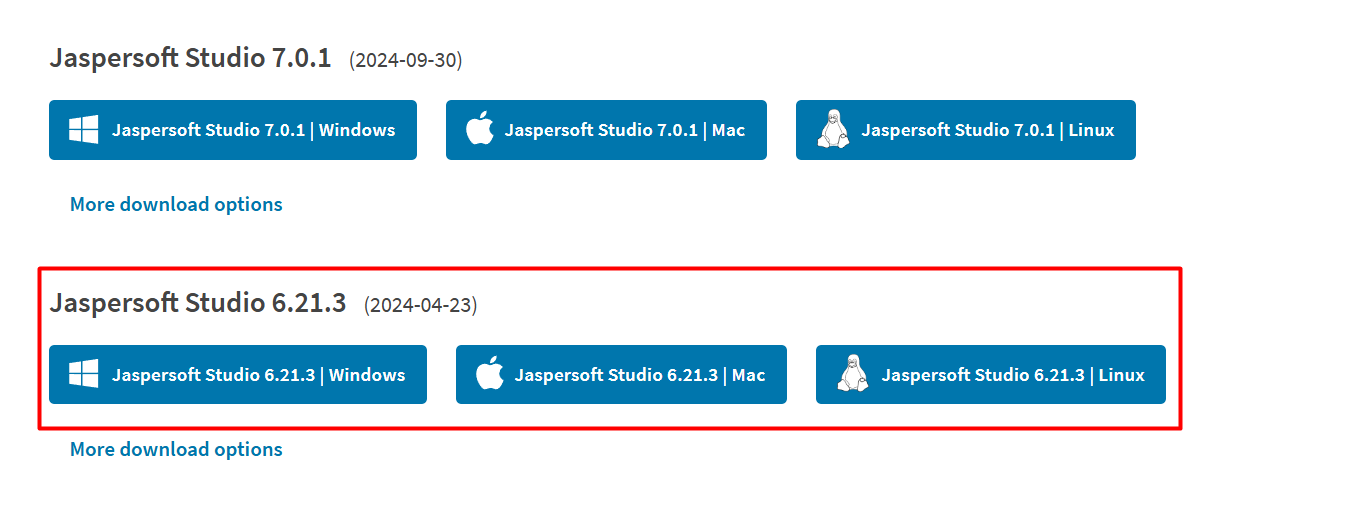 We will use Jaspersoft Studio to create .jasper files. It is a standalone software that offers the same environment as the Eclipse plugin, Jaspersoft Studio. For compatibility, please ensure you are using at least Jaspersoft Studio version 6.21.3. It can be downloaded using the following link, as shown in the figure below. Choose the version for your operating system (Windows, Linux, or macOS).
