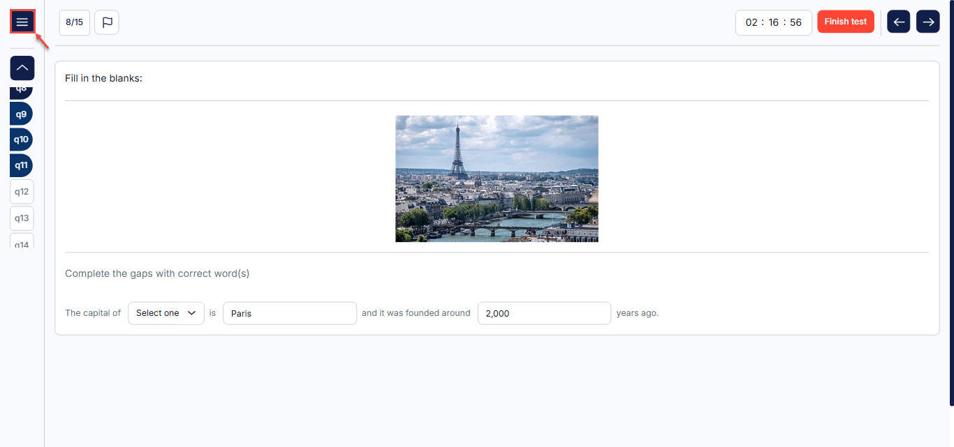 Note: If a candidate cannot see the list of questions, they can access it by clicking the hamburger menu in the top-left corner. Alternatively, they can try zooming out, as the system may adjust the layout of the exam page depending on the screen size.
