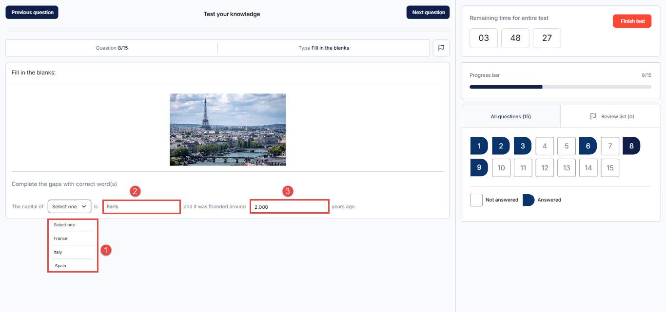 - Drop-down selection – Choose the correct phrase from a list.