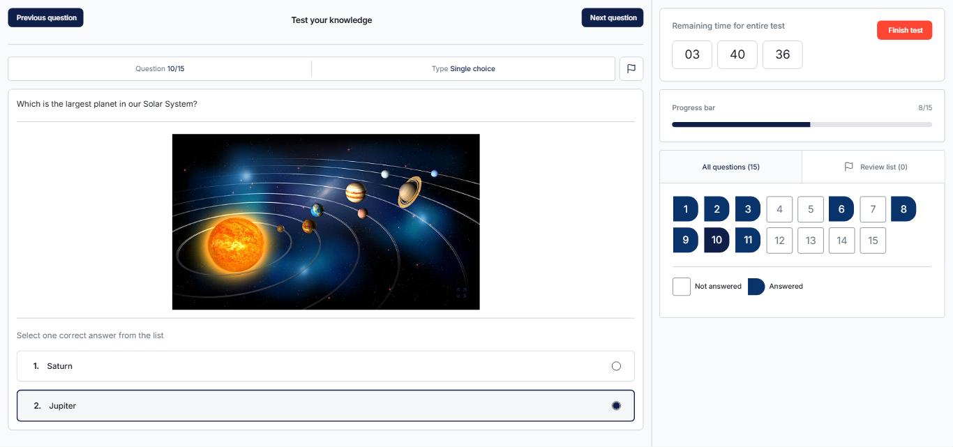 Ordering questions present a list of items in an incorrect sequence. Candidates must arrange them in the correct order by dragging and dropping. These are useful for chronological or process-based assessments.
