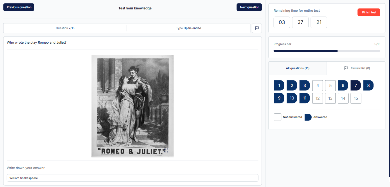 Essay questions require candidates to provide a detailed written response or upload a file. Depending on the question configuration, candidates can also answer the question by filling out a PDF document. These are the only question types that must be manually graded after the test is completed. For detailed information on how to answer an essay question, please visit this article.