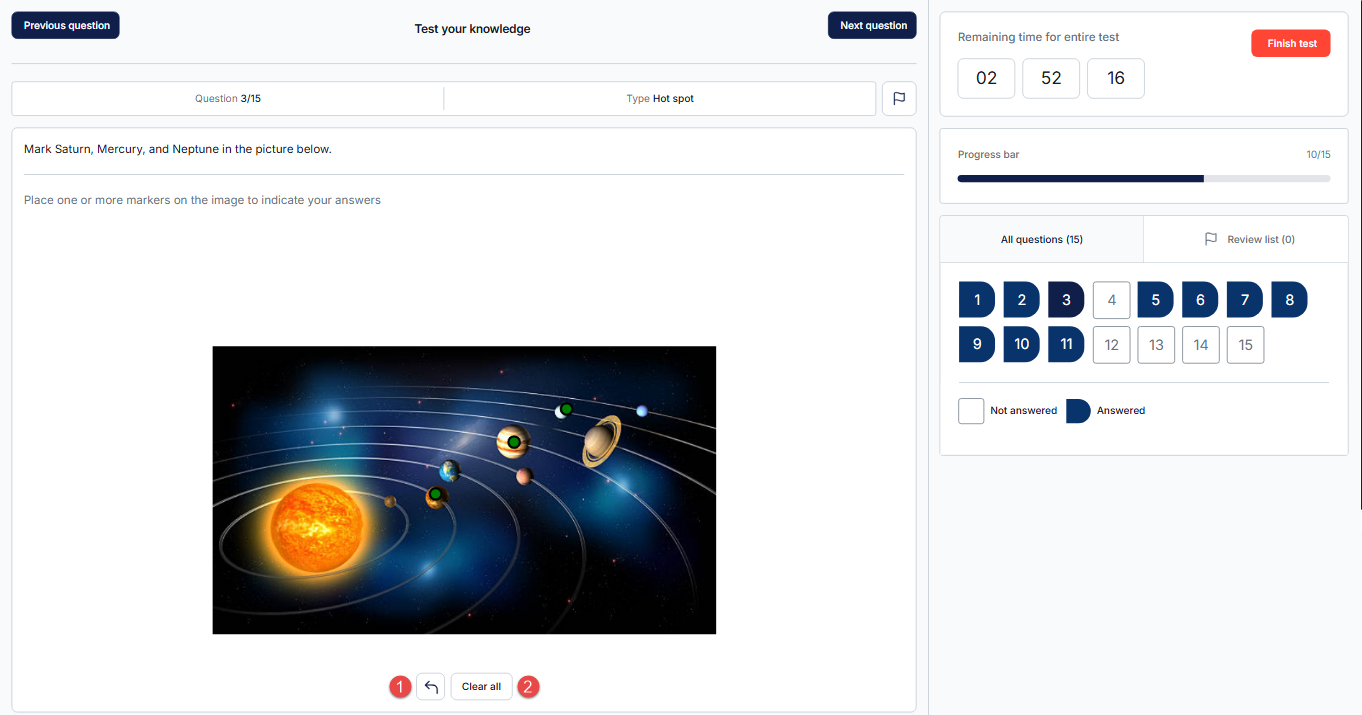 - Clear all – Clears all selected areas, allowing the candidate to start over.