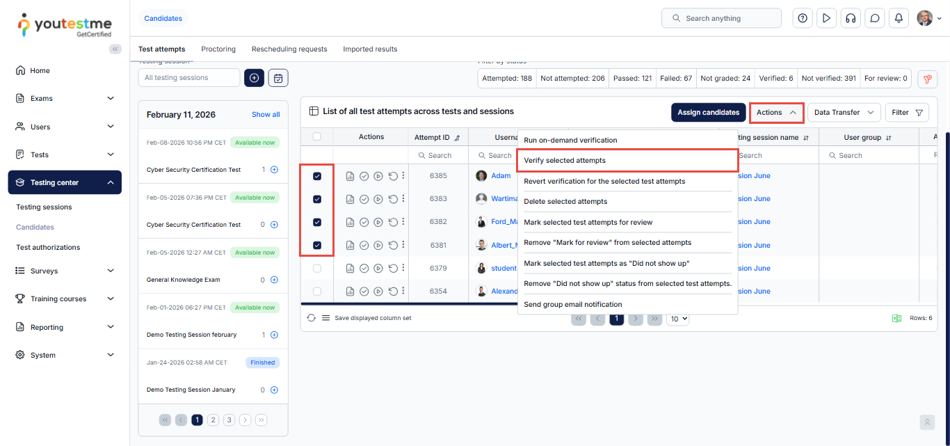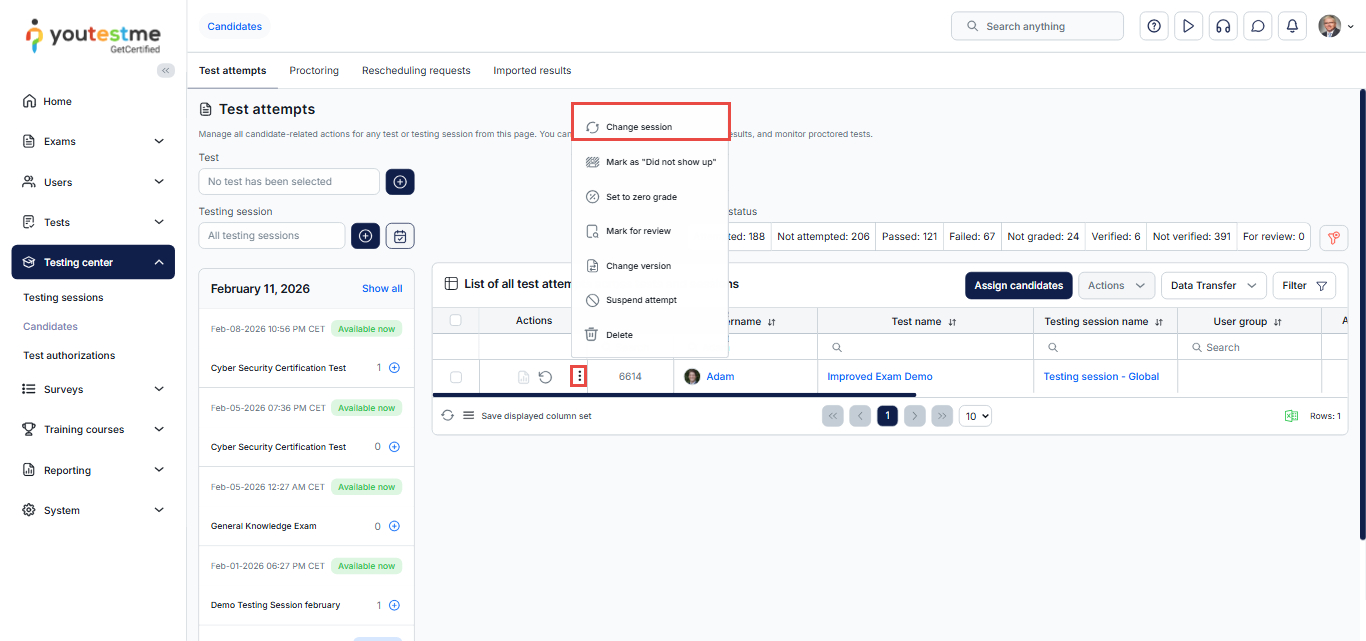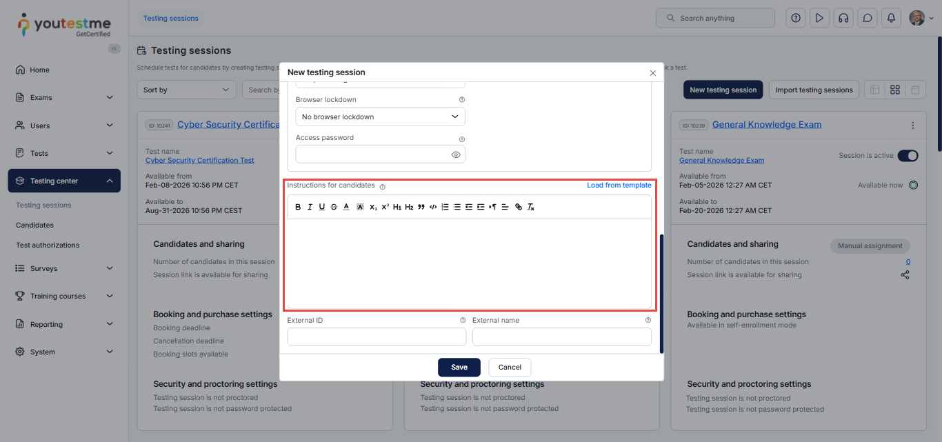 A testing session serves as an organizational unit that defines key exam details, including availability, deadlines, authorization, and payment. CSRs can set suitable time slots for candidates, create a session calendar, and include session instructions that are automatically sent to candidates when they book a session.