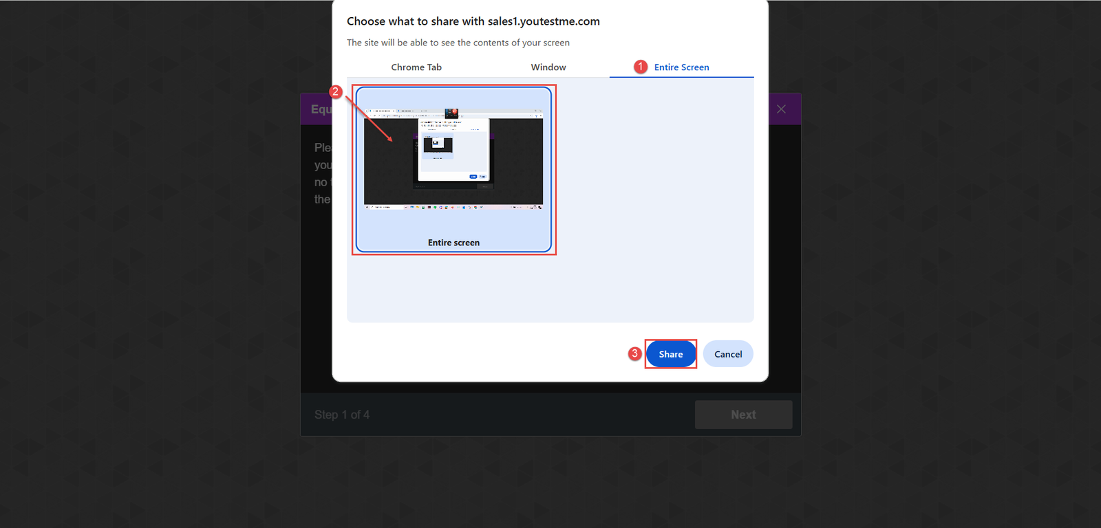 During the first step of the Equipment check, the system will prompt you to choose what to share. Please ensure that you select the “Entire Screen” option.