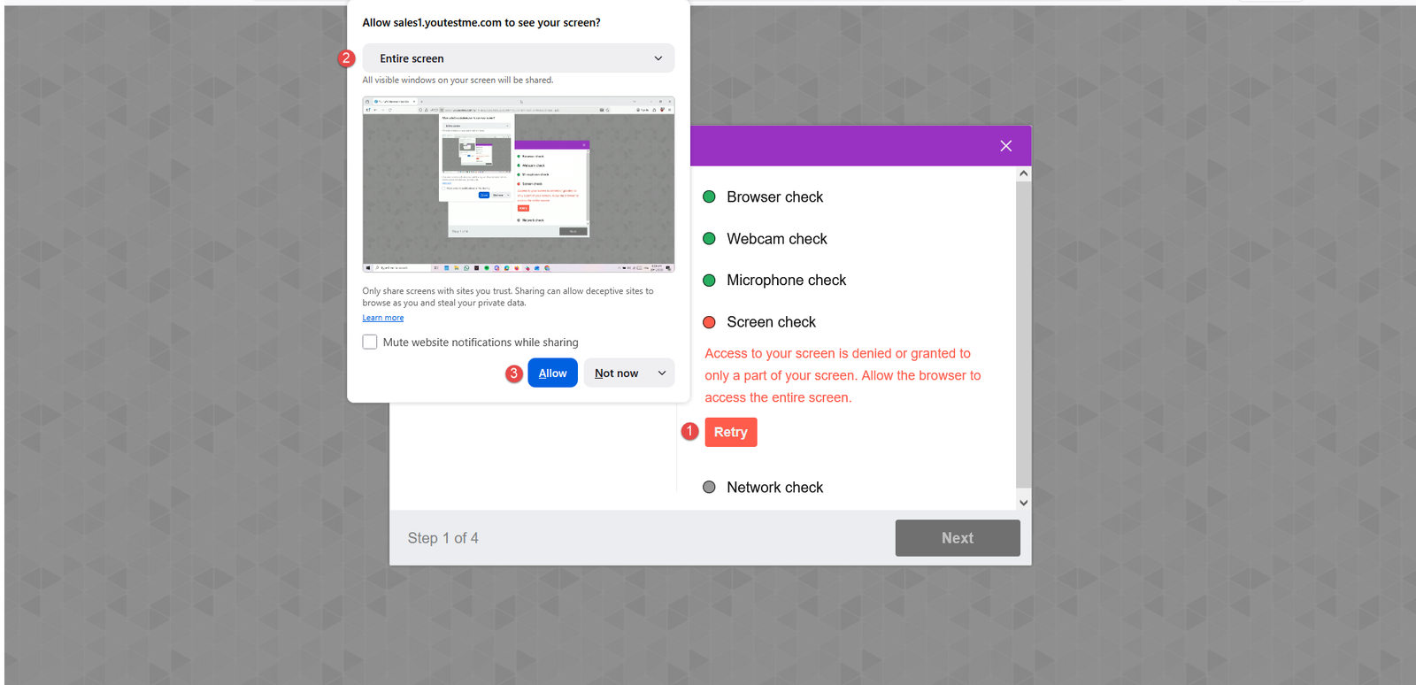 - Click the Retry button during the system check, and a screen sharing permission window will appear next to the URL.