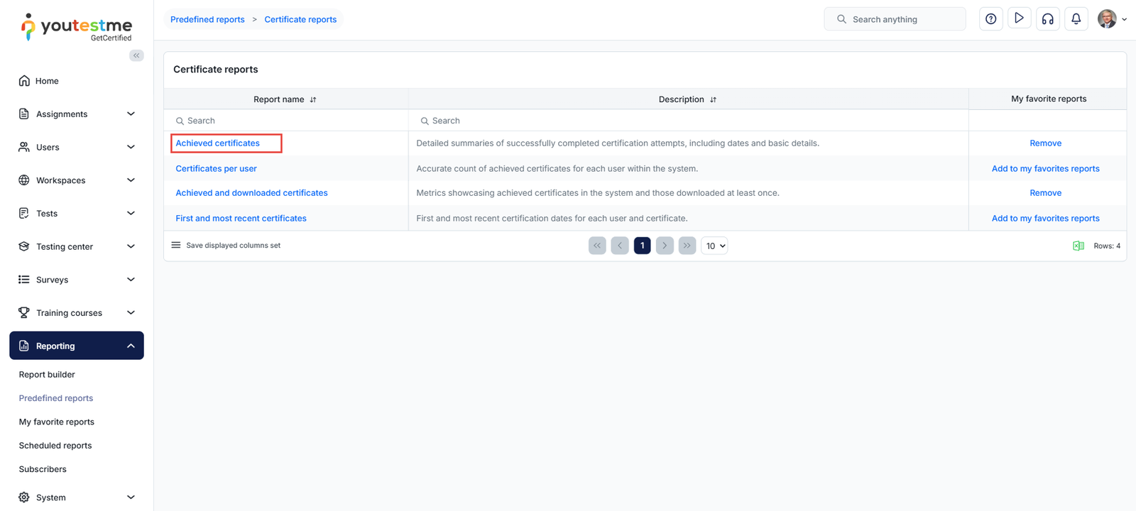 The table with all reports related to the certificates, organized by topic, will be presented. Select the Achieved certificate.