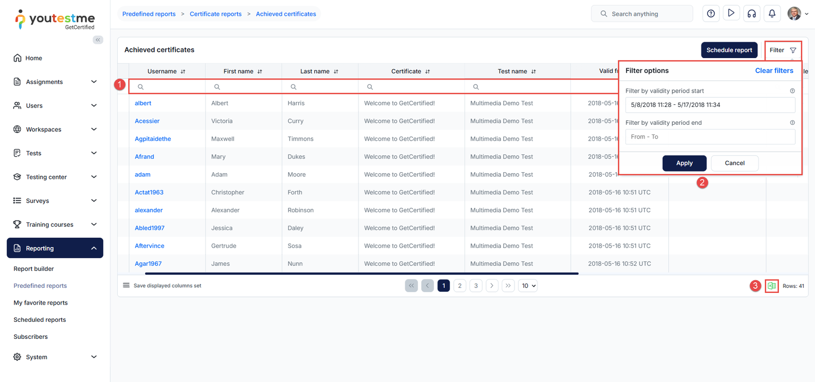 The table with archived certificates will be presented. The reports contain information about the achieved certificates for all candidates in the application. You can: