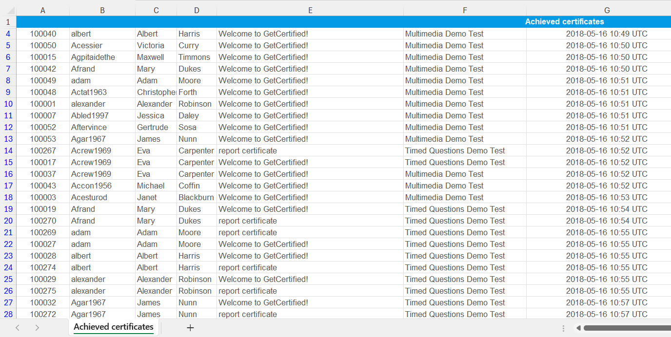 The image below shows an Excel file’s predefined report for achieved certificates.