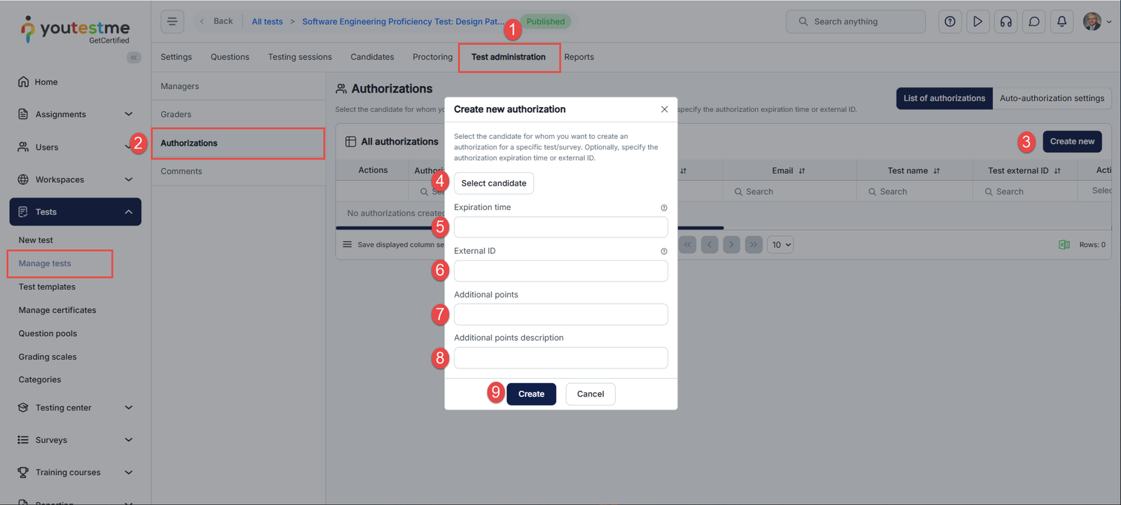 - In the Test administration menu on the left side, click Authorizations to open the authorization list.