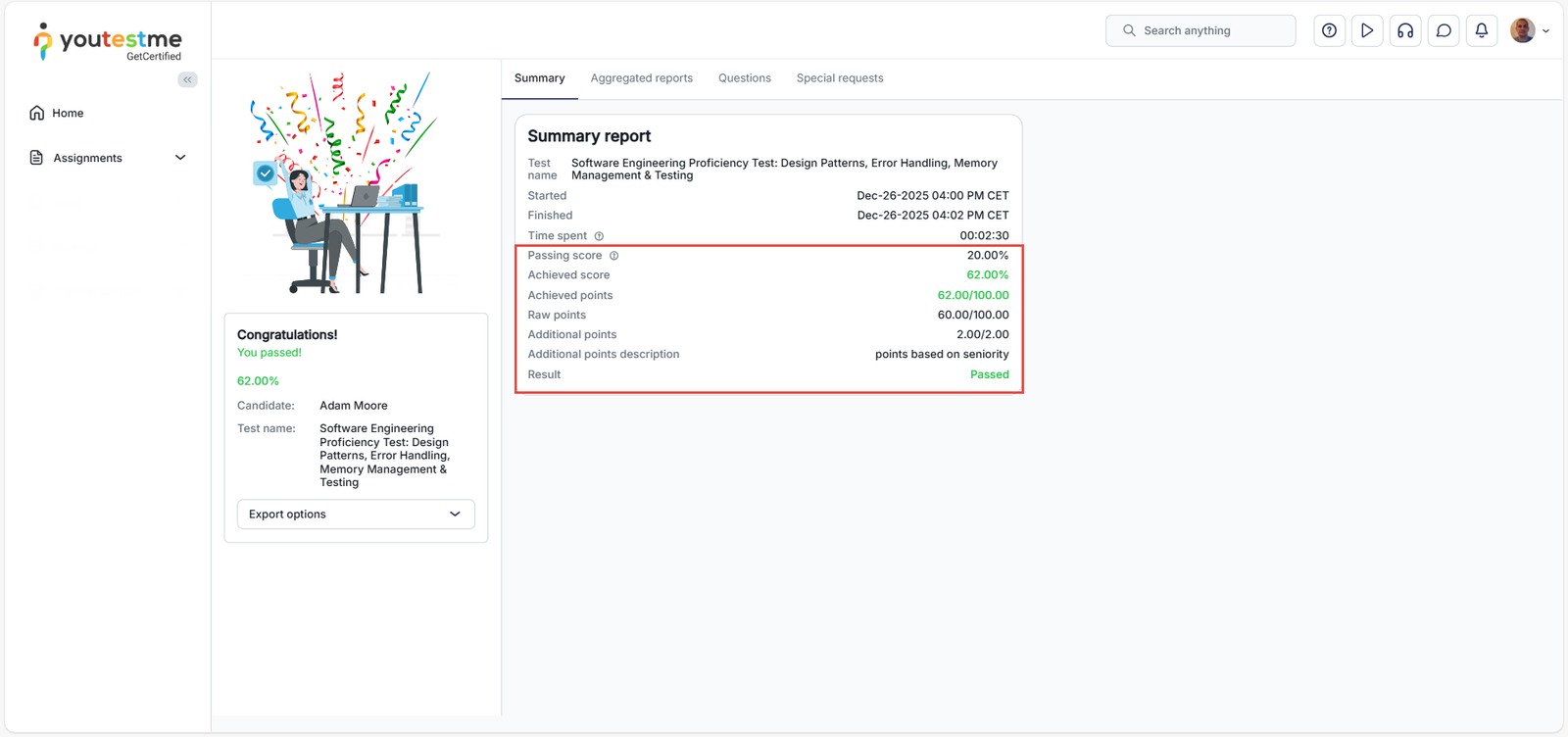 In the candidate’s personal test report, additional points are displayed prominently in the Summary Report section. Candidates can see: