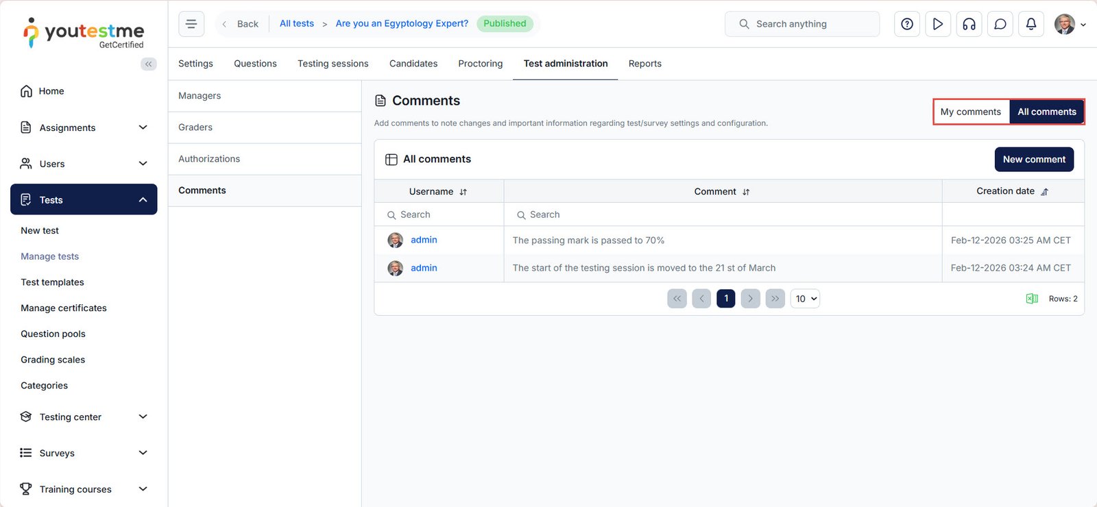 This feature is particularly useful when multiple users manage tests or when it is necessary to keep a record of modifications for future reference. Comments help maintain transparency and provide a simple way to review the history of changes made to a test.