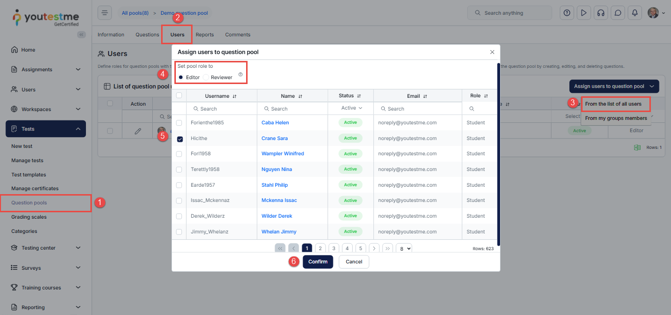 - Navigate to the Users tab and select the Assign users to question pool option.
