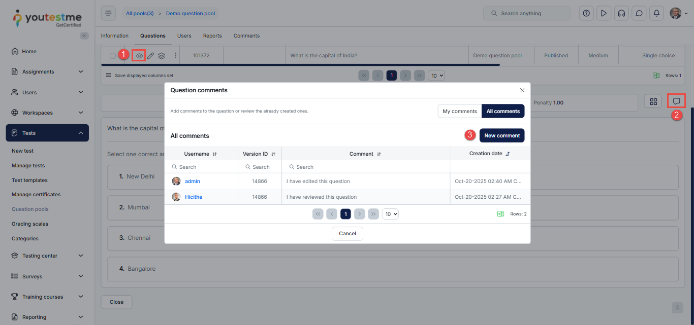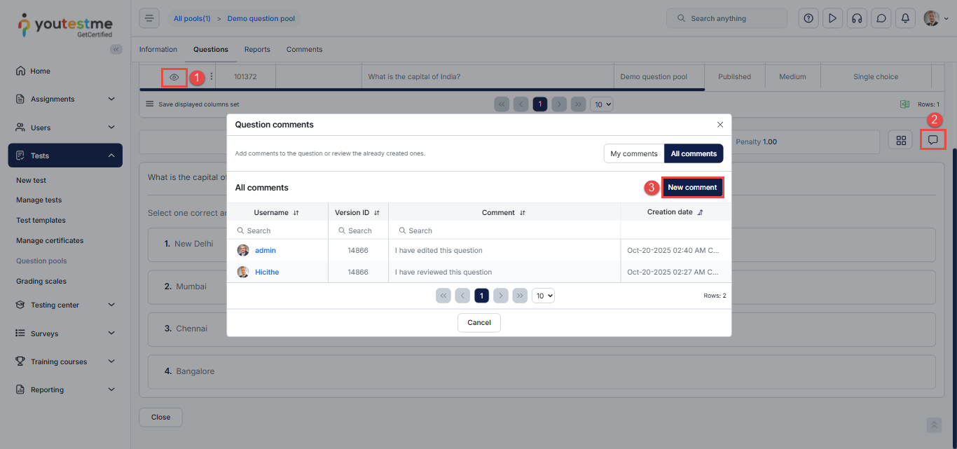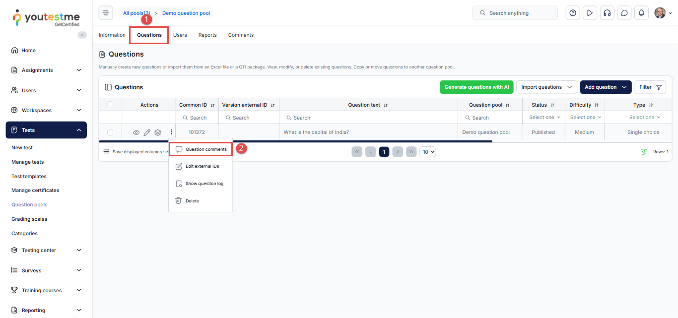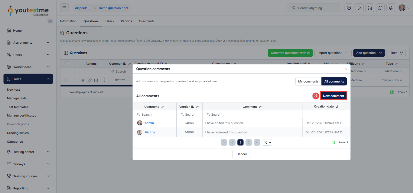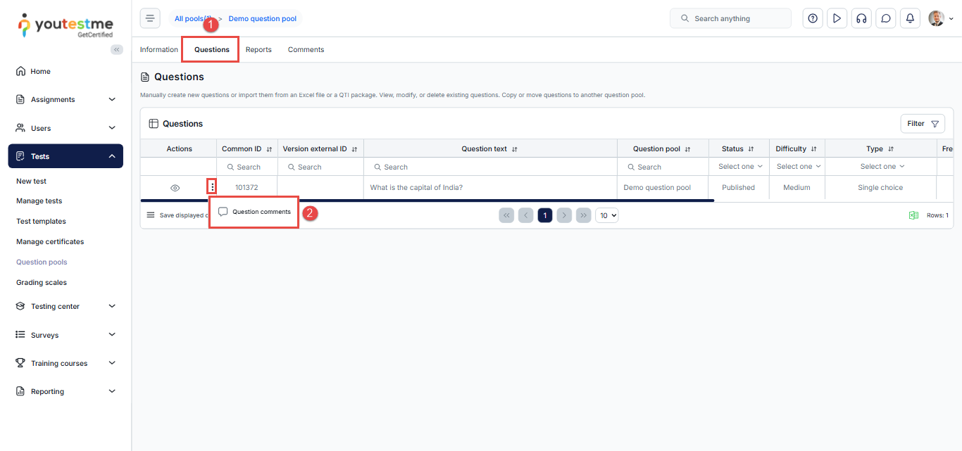 - From the Actions column, click the three dots (⋮) and select Question comments.