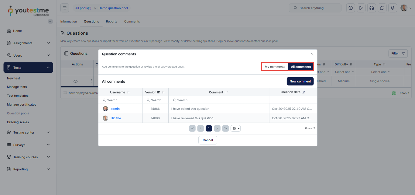 Additionally, you can switch between All comments, where you can view all comments for that specific question, and My comments, to see only the comments you’ve added.