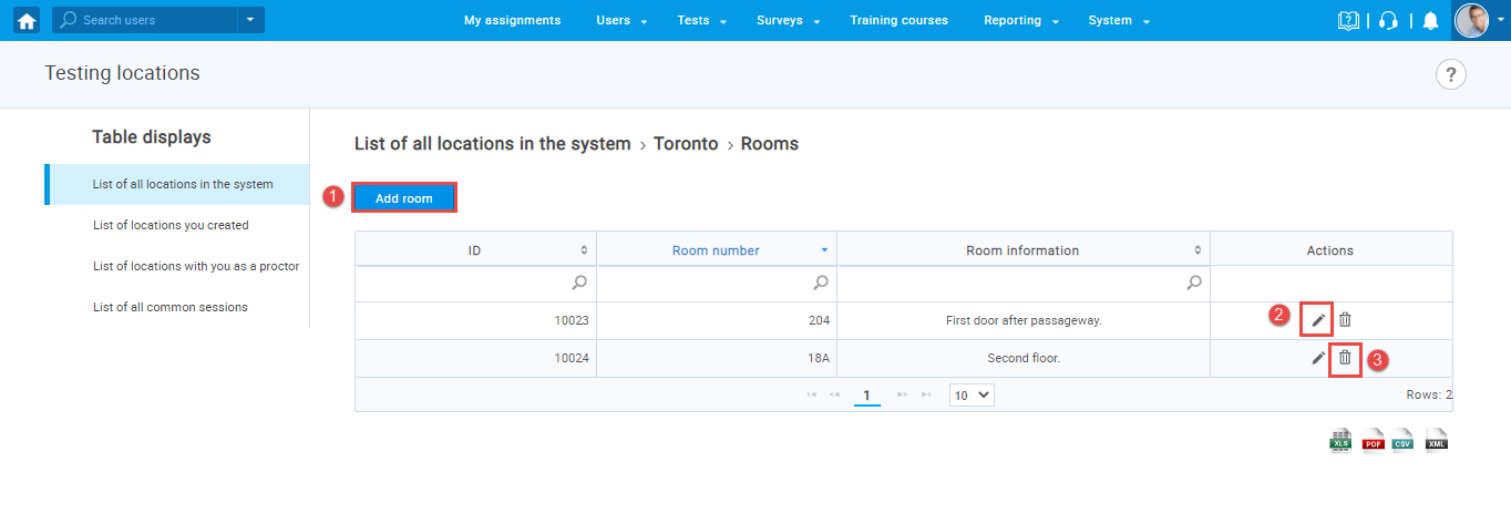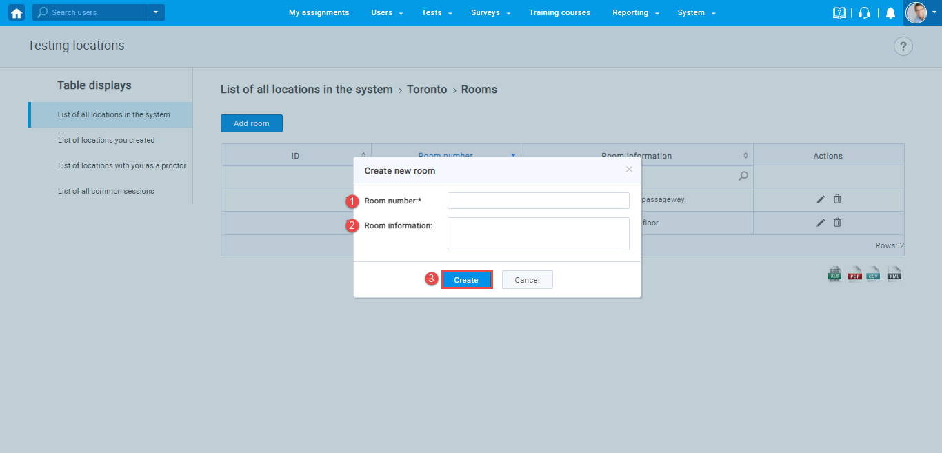 To create a new room, navigate to the “Test” in the main menu and click on the “Testing locations”.