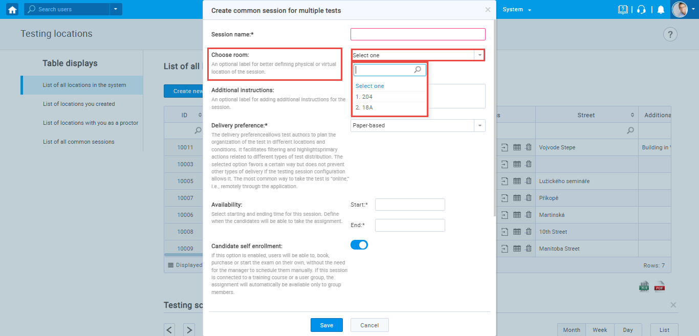 Once you create room for a specific location, you will be able to select created room from the drop-down menu when creating common sessions on that location