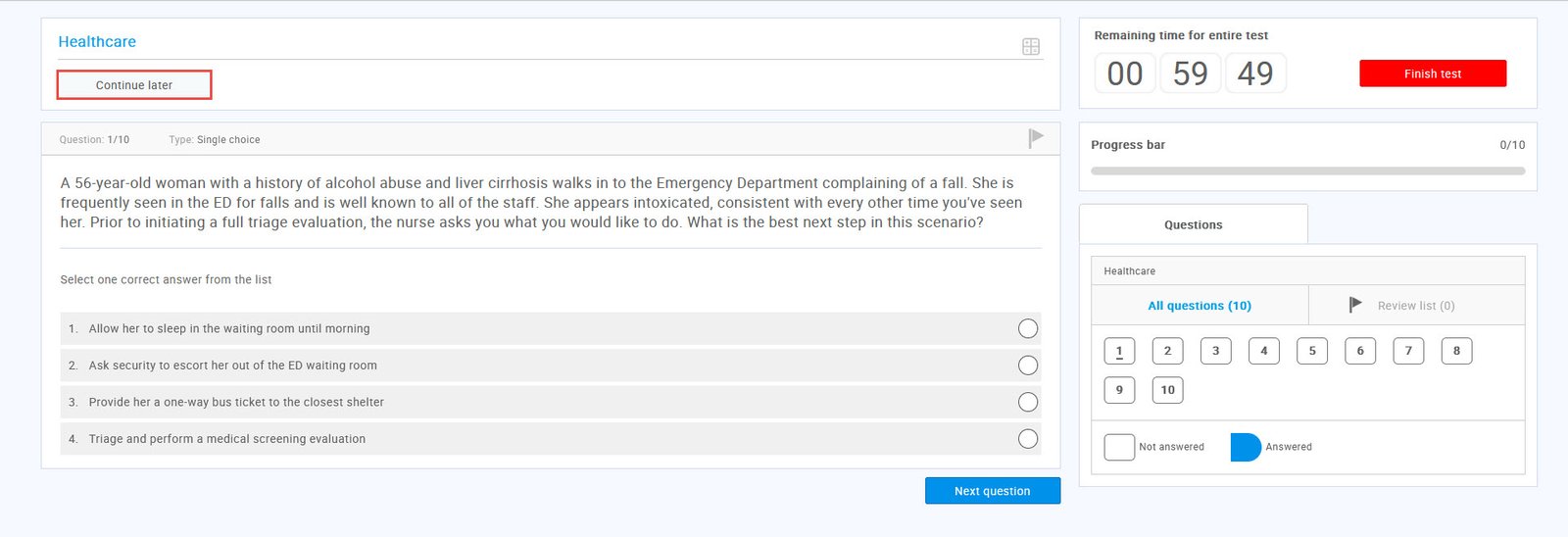 If enabled, the candidates can pause, and later continue the test within the test availability period. The candidate can accomplish this during the test attempt by clicking on the “Continue later” button.