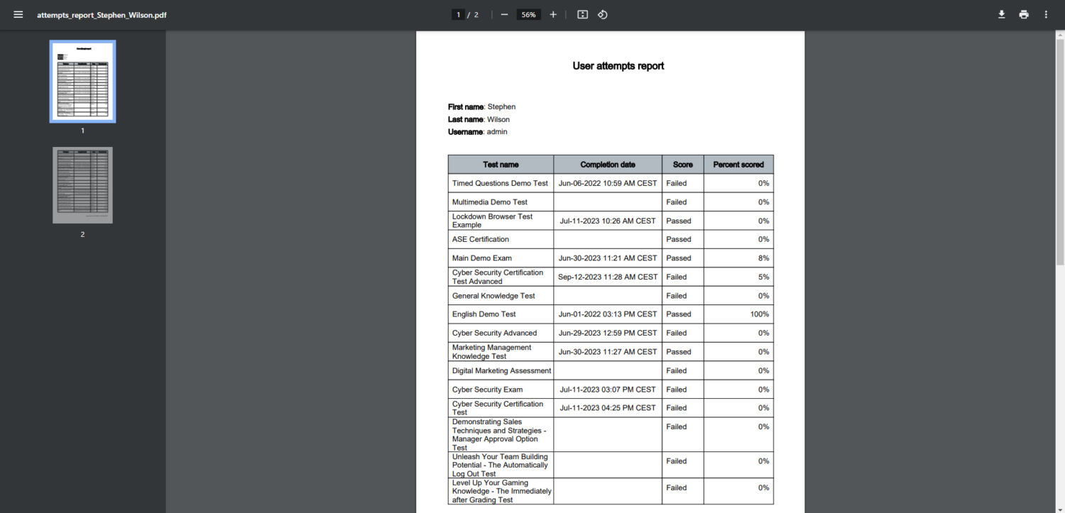The template will be downloaded as a PDF file where you can preview all user’s test attempts.