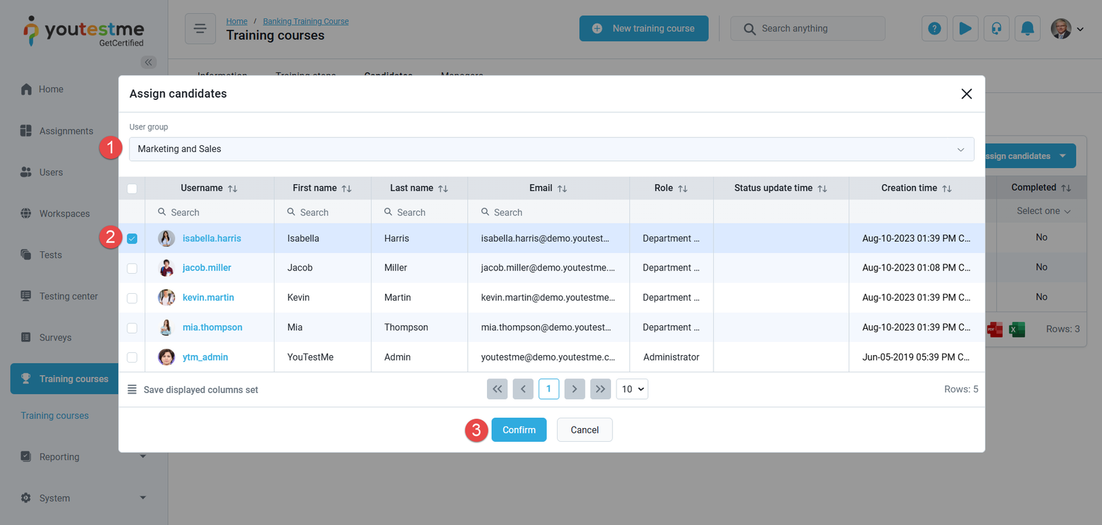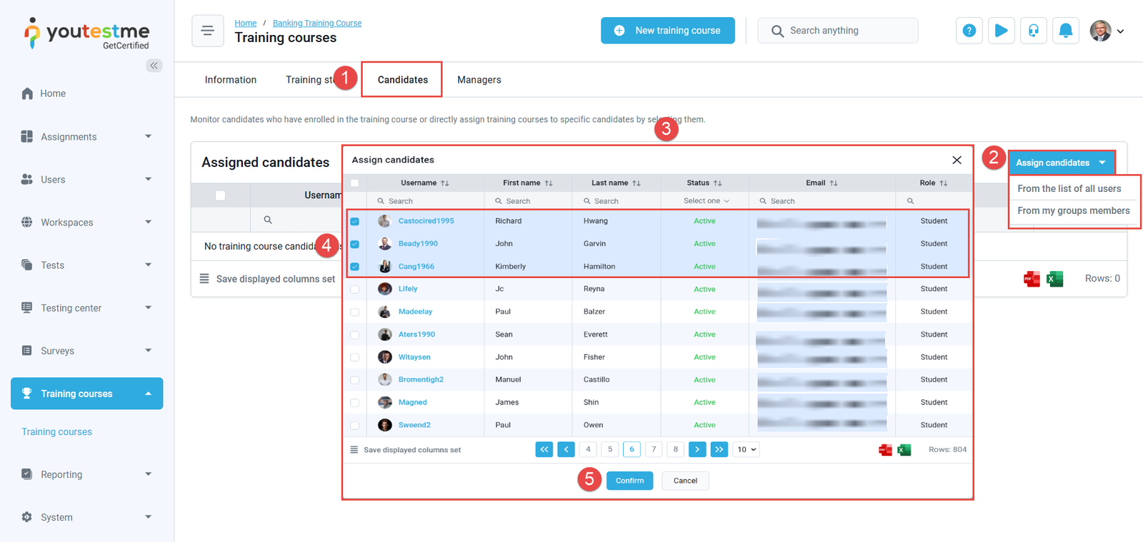 - Select the candidates you want to assign to the training course by checking the box in front of their usernames.