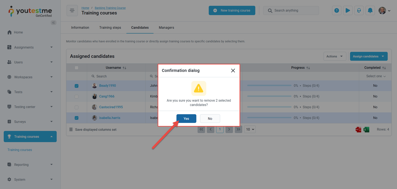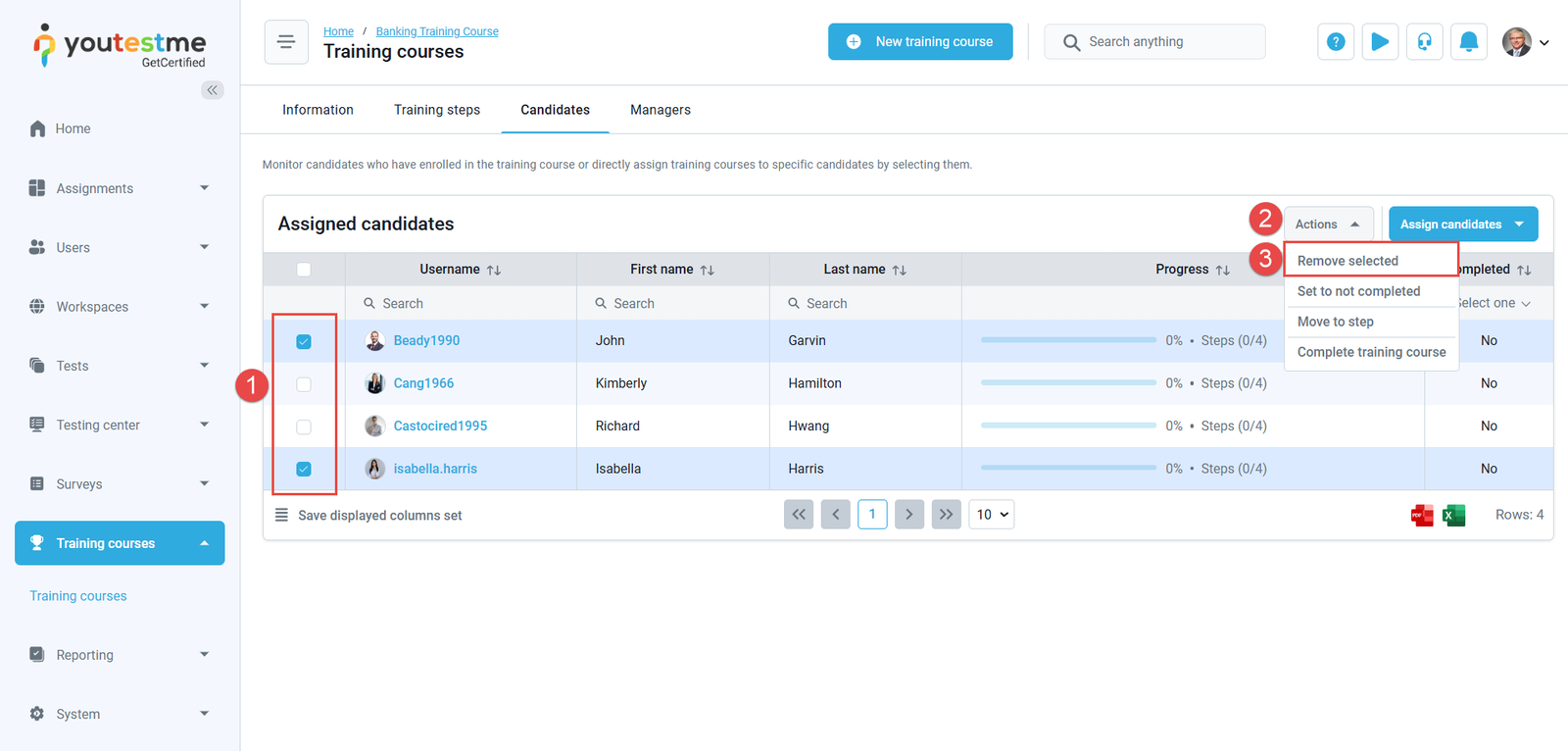 - Select the candidates you want to remove from the training course by checking the box in front of their usernames.