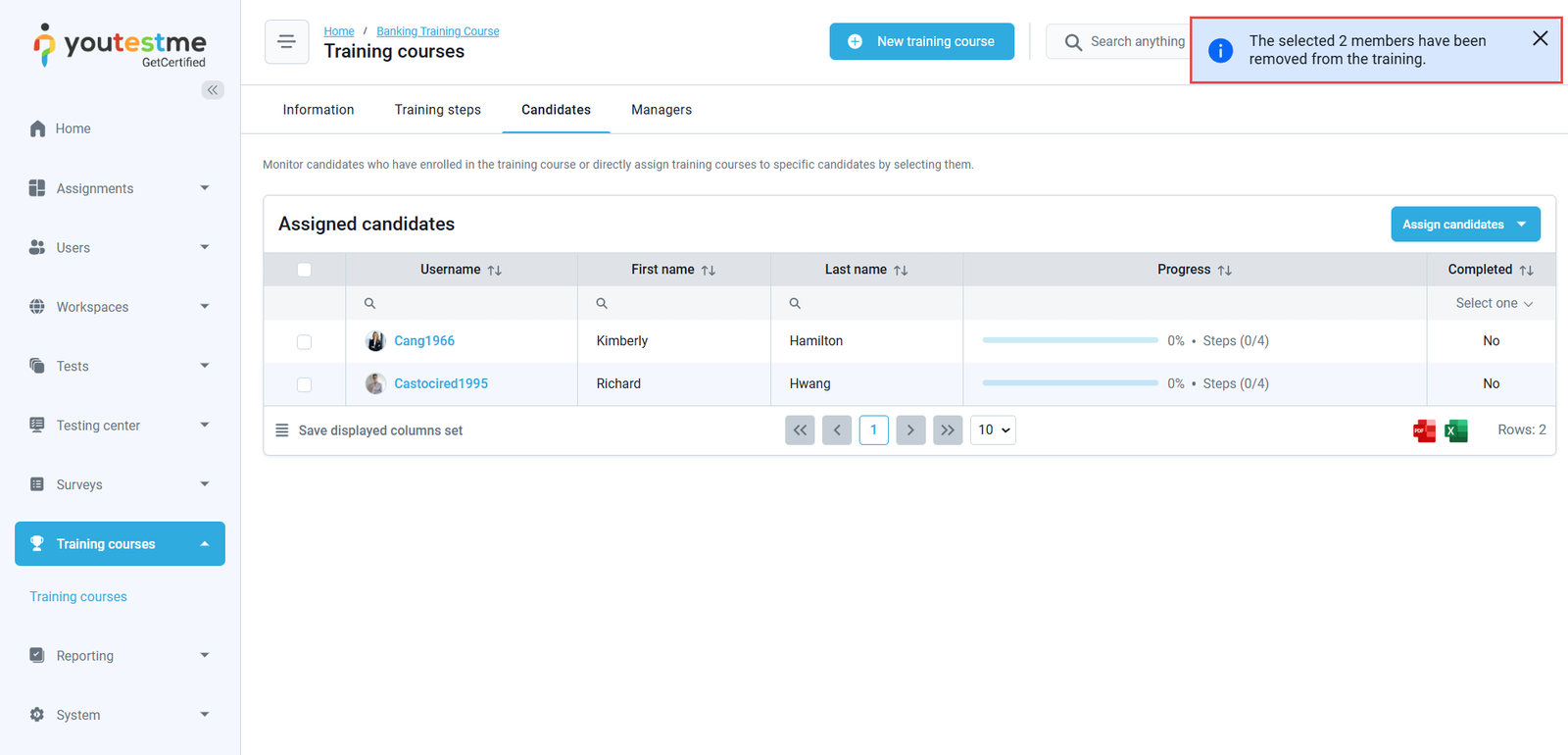The users’ list will be updated, and the unassigned candidates will not be able to find the training course in their assignments.