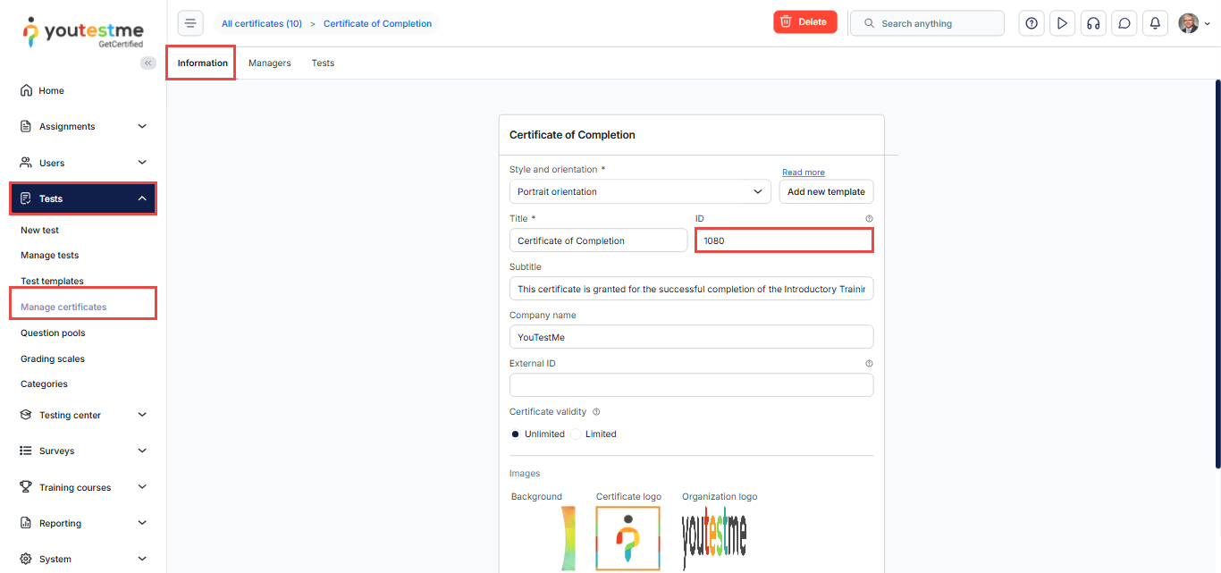 To find the certificate ID, select the Tests/Manage certificates tab, select your certificate, and check the ID field.