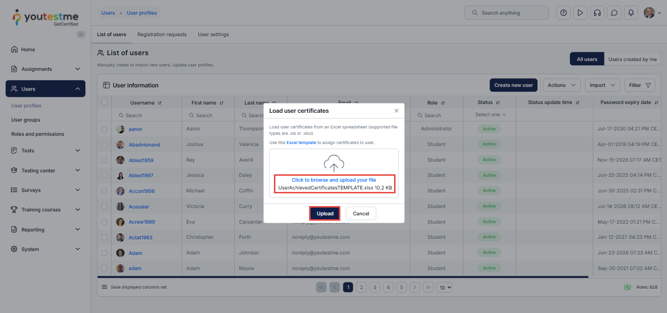 After filling in the Excel template, navigate back to the Load User Certificates page, click Upload your file, select your Excel template, and then click Upload.
