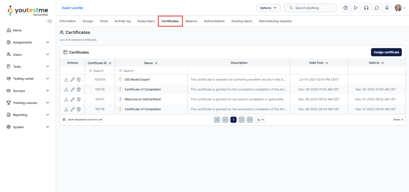To check the certificates you awarded to a single user, you can go to their profile and navigate to the Certificates tab.