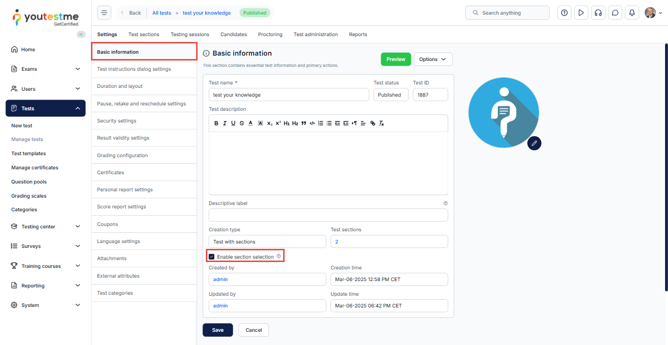After creating a test with sections, navigate to the test settings, tick the box with the Enable section selection option, and save changes.