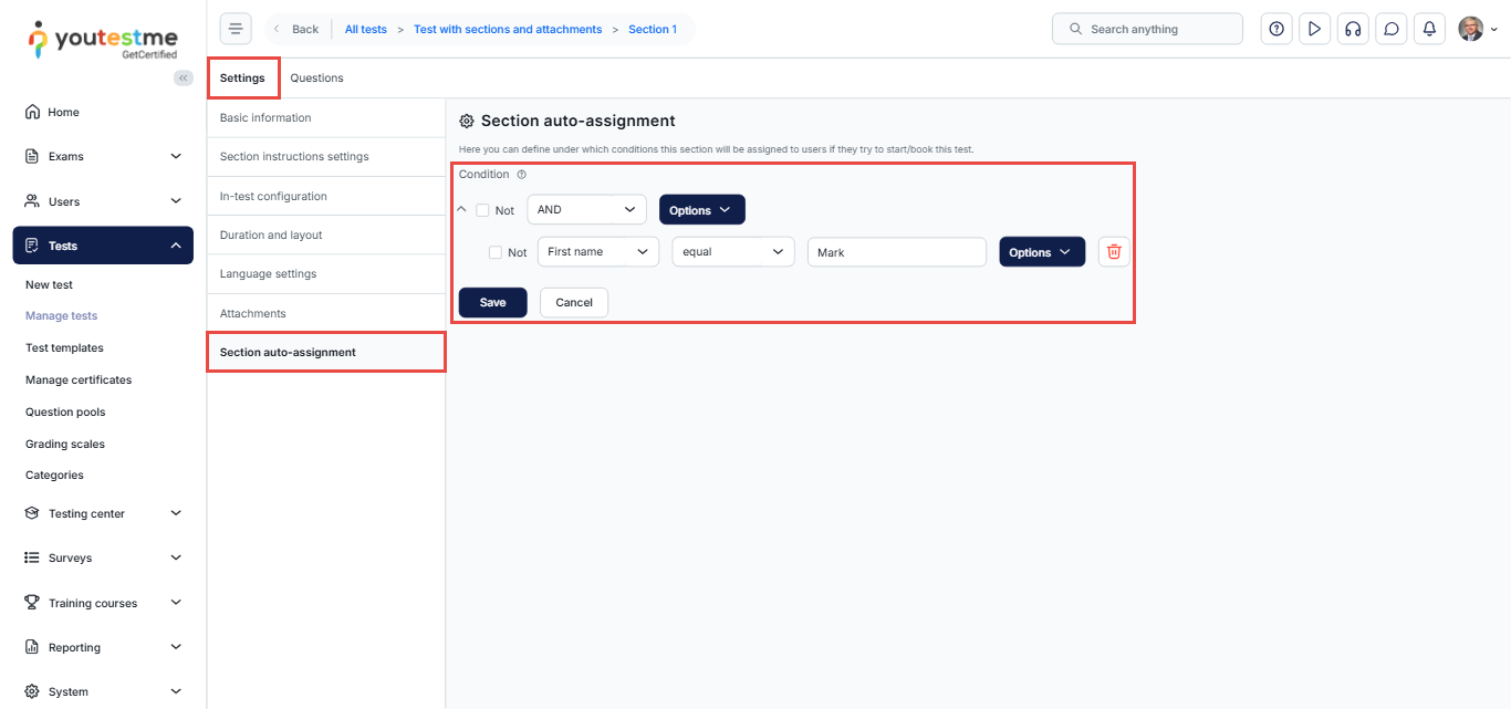 In the Settings tab, select the “Section auto-assignment” option and define the desired conditions.