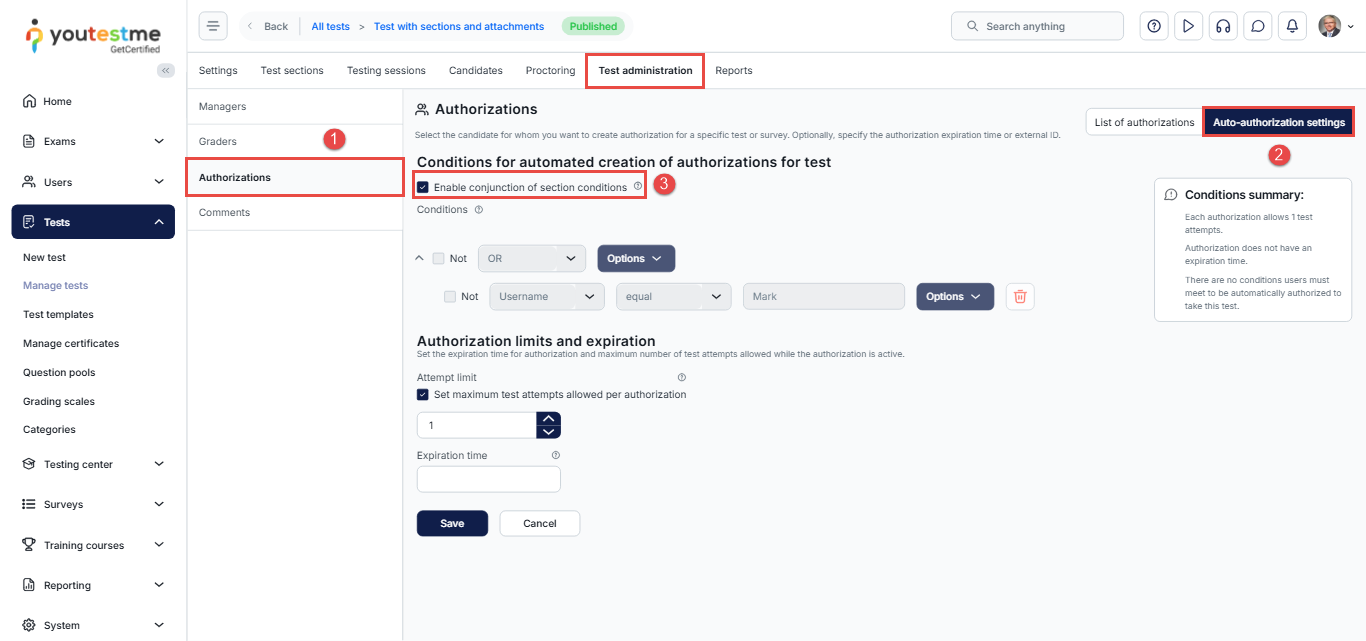 Once enabled, the conditions of all sections will automatically apply to the test authorization condition and cannot be modified manually.