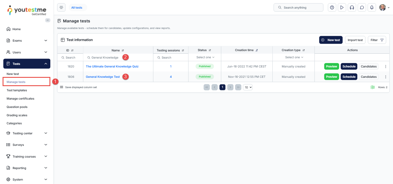 - In the main menu, select the Tests and click the Manage Tests sub-module.
