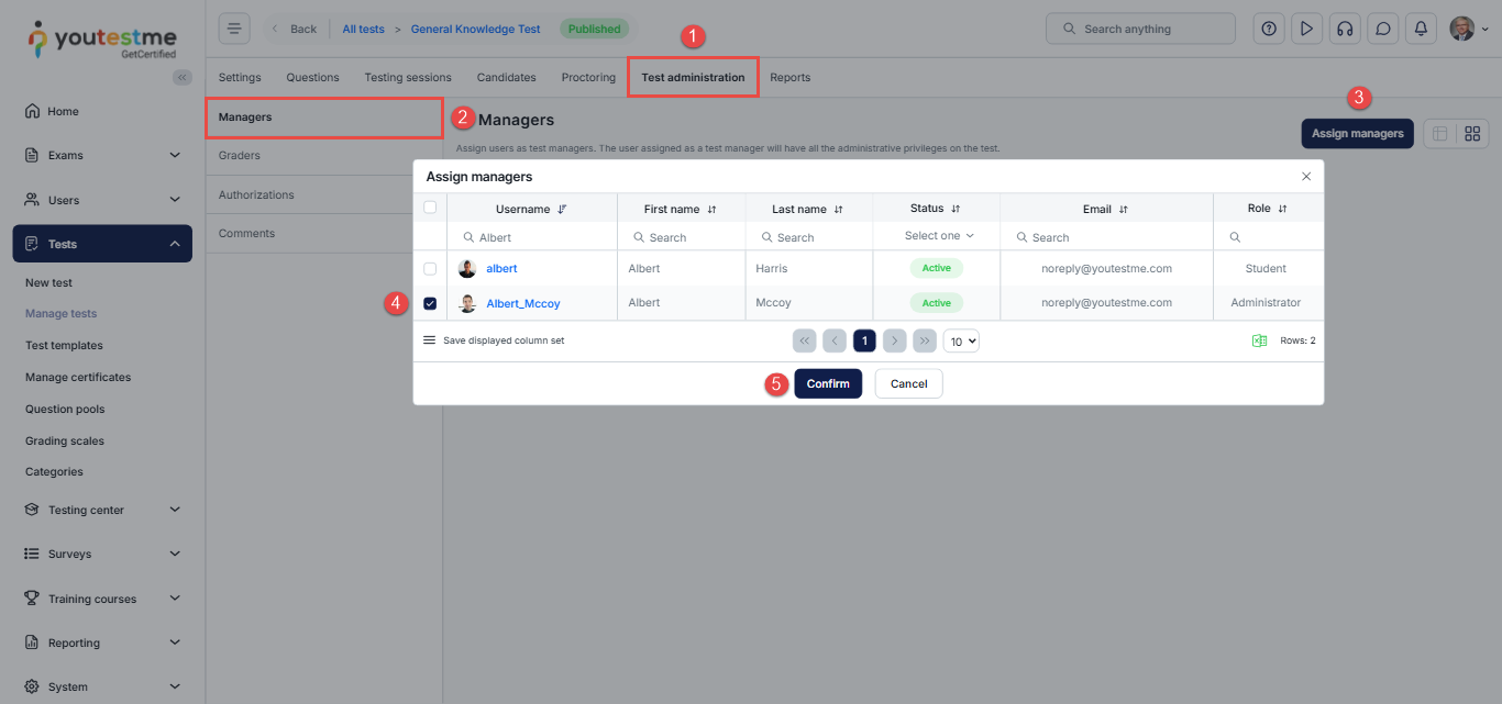 This article explains how to assign or remove Test Managers for a test. Test Managers have full administrative access to the assigned test, allowing them to configure test settings, monitor attempts, review results, and manage the overall testing process. This is useful when multiple users need shared responsibility for managing a test.
