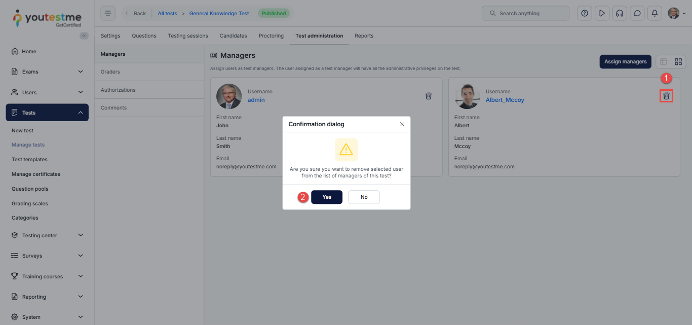 To remove a user from the test managers’ list: