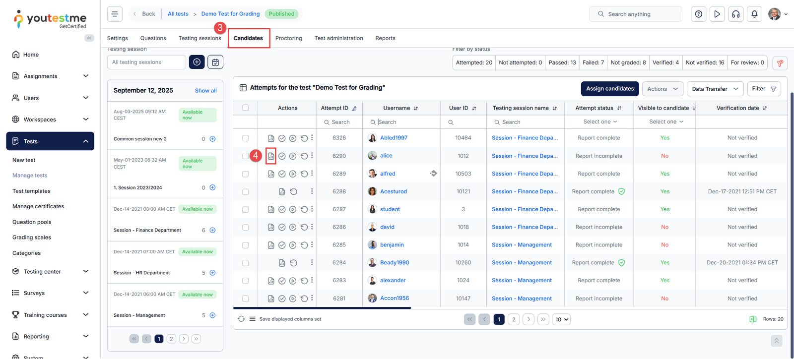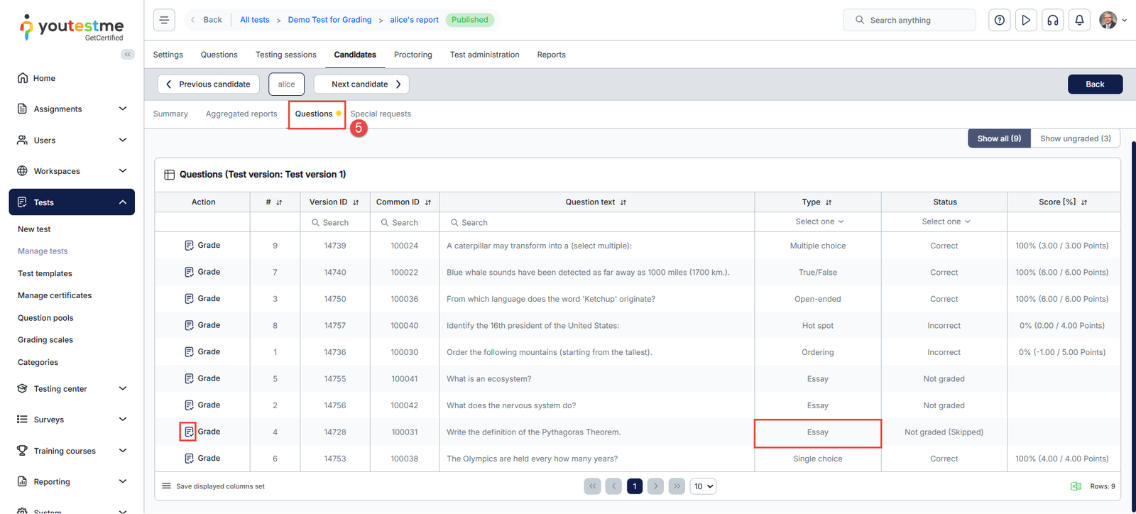 - Open the Candidates tab and locate the candidate who needs grading.