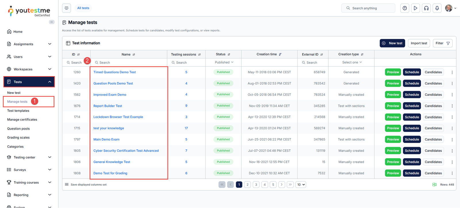 - From the side menu, navigate to Tests and choose Manage Tests.