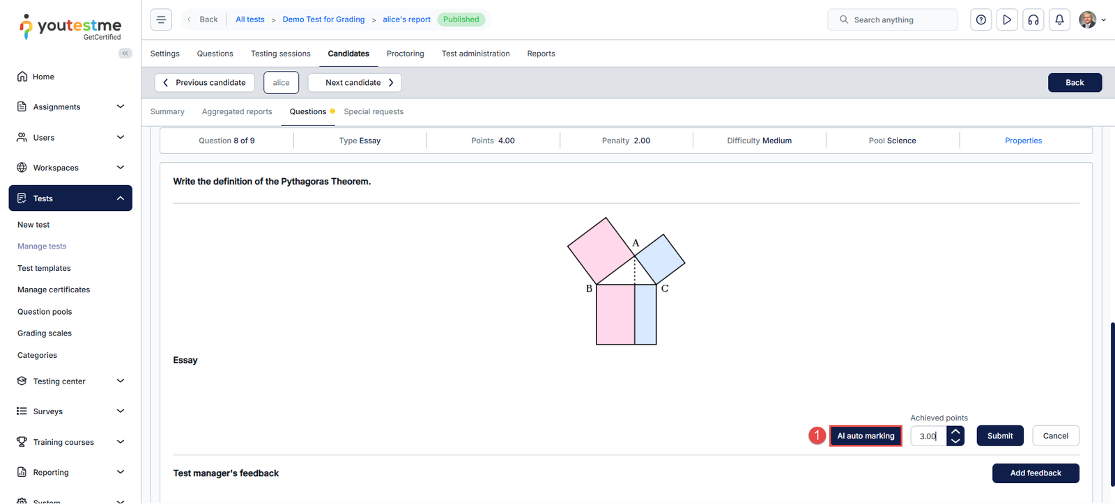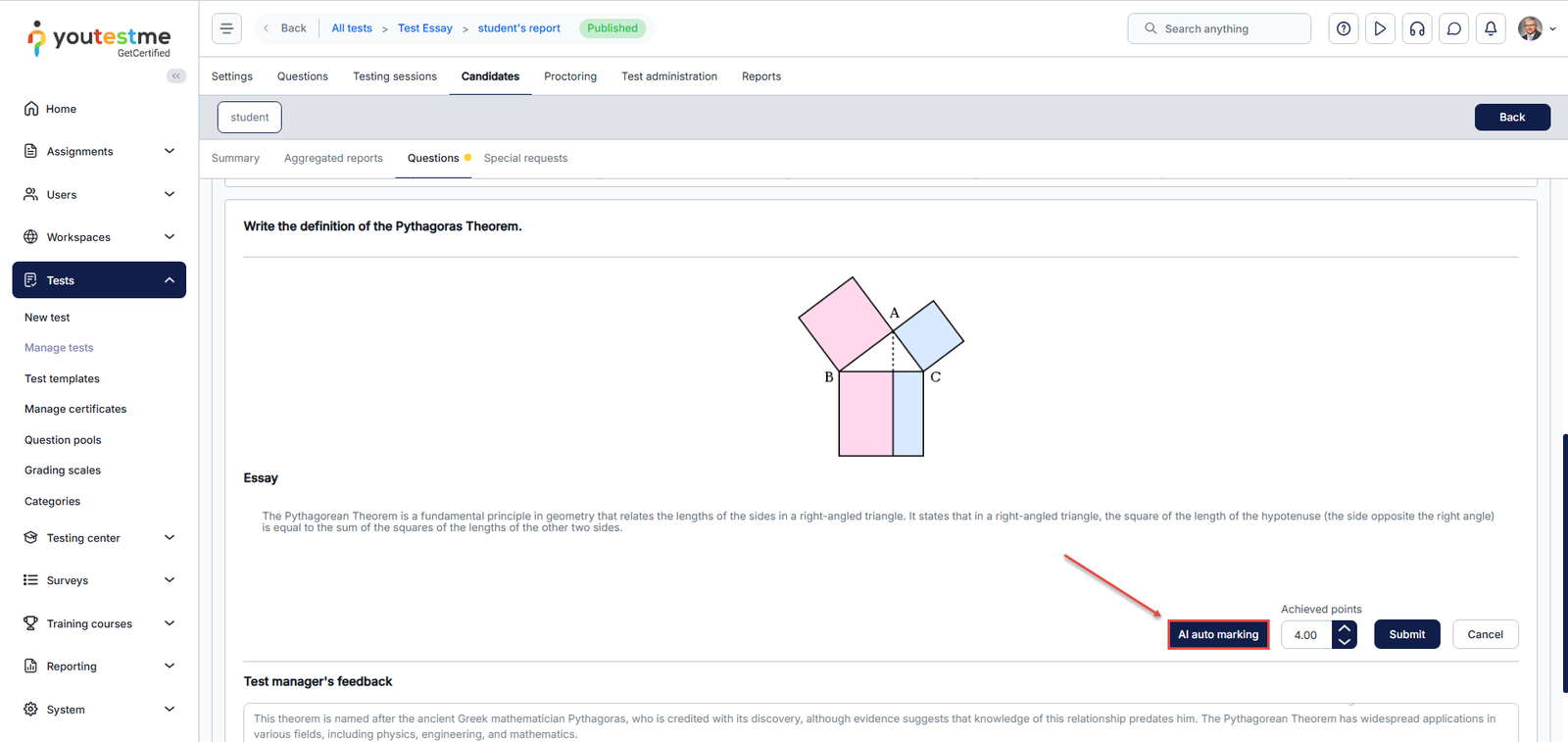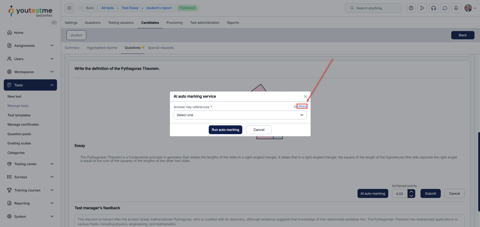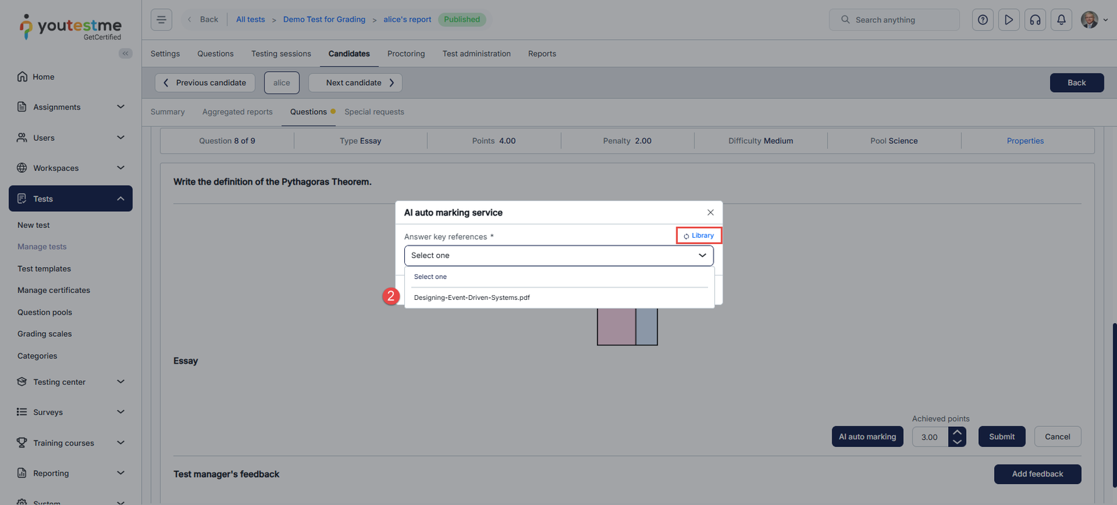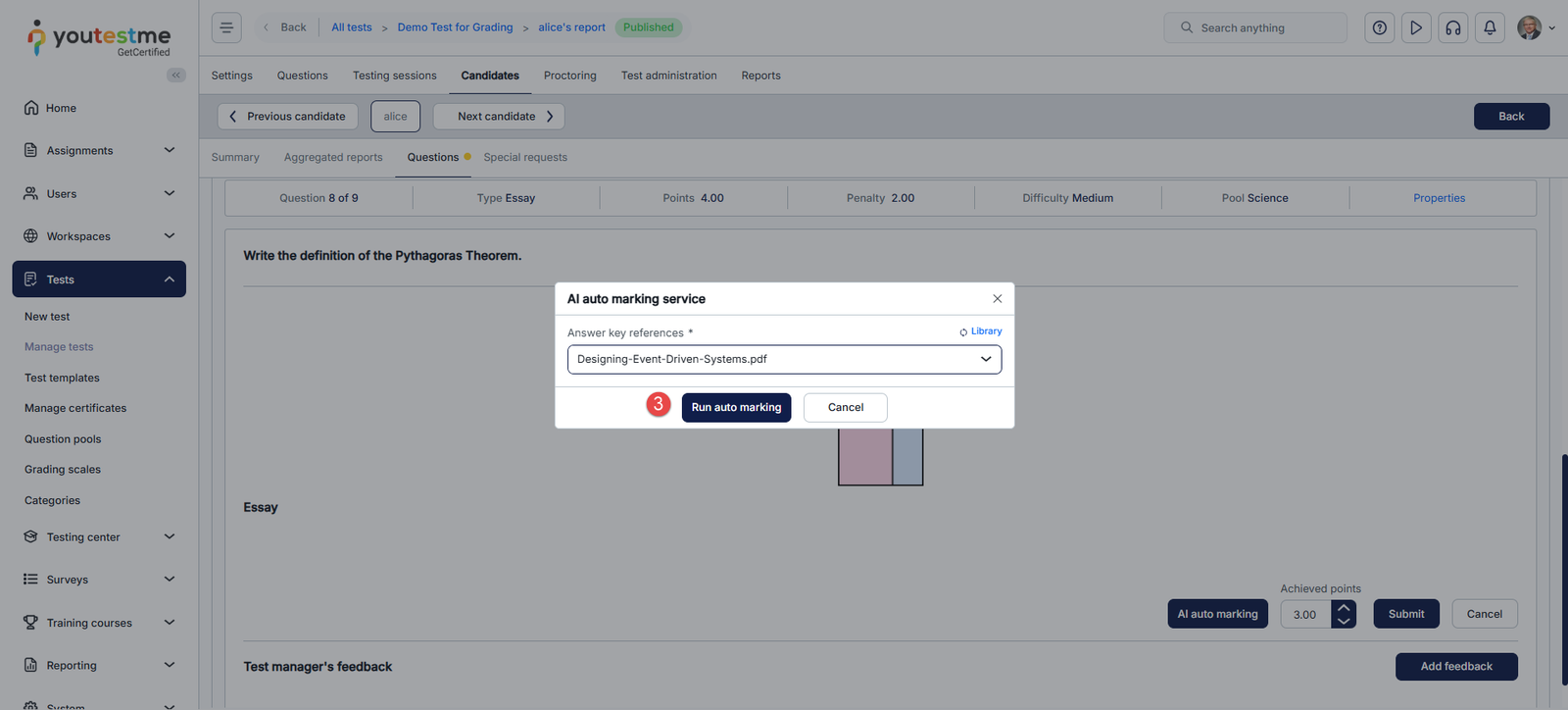 This article explains how to automatically grade essay questions using AI in YouTestMe GetCertified. It walks you through accessing the candidate’s attempt, setting up and running the AI auto-marking process with reference materials, and reviewing or adjusting the final scores.