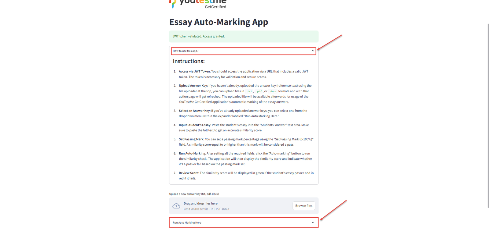 Please read these instructions carefully to understand the concept of essay auto-marking. - Colapse the “How to use this app?” section and expand the “Run Auto Marking Here” section.