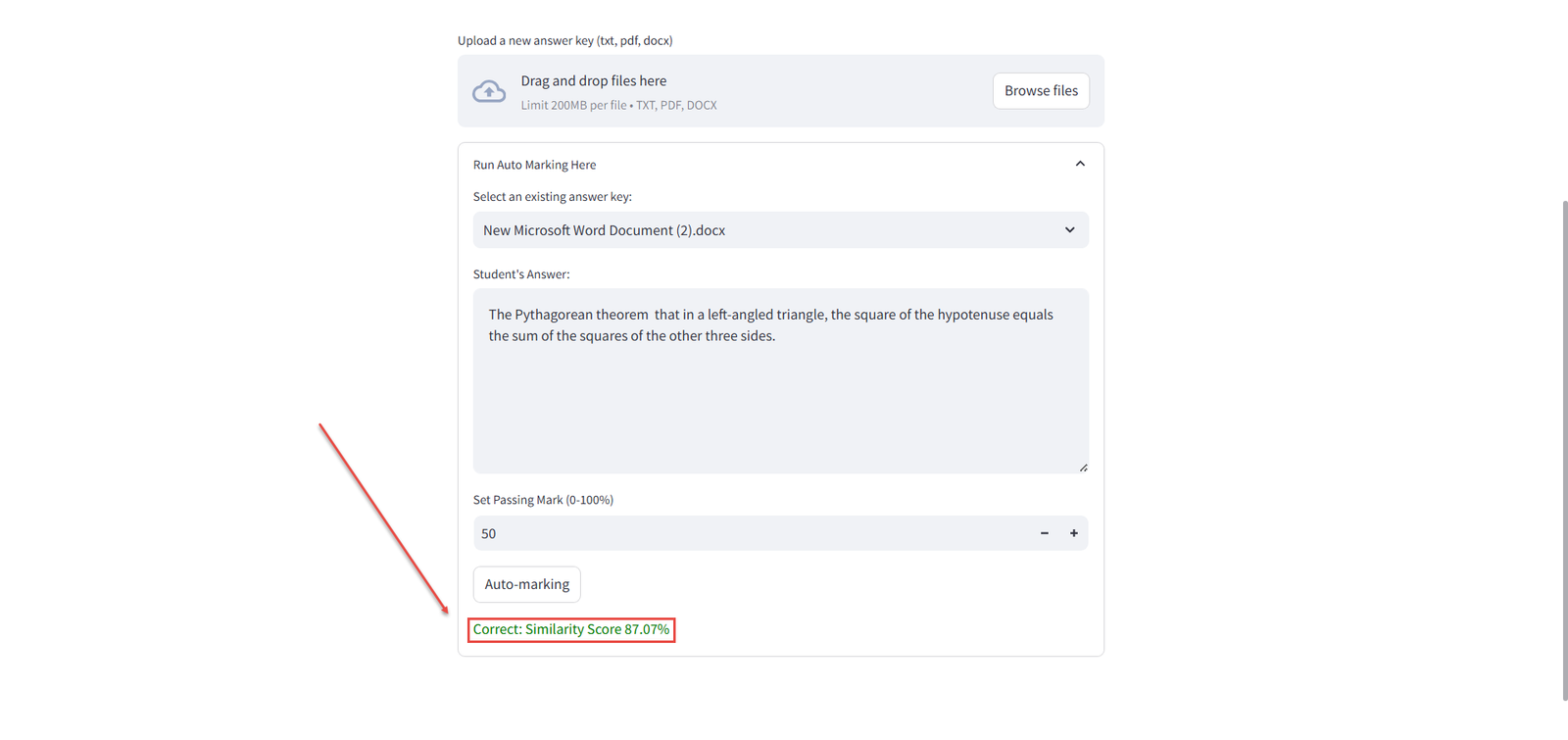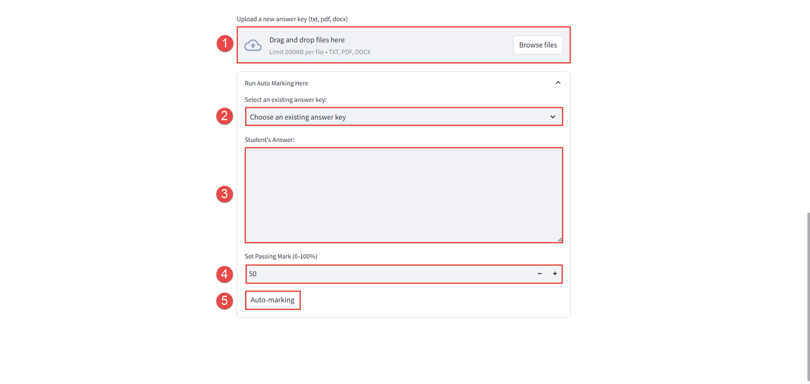 - Browse files – Upload a file (TXT, PDF, or DOCX) that will serve as the Answer Key reference for grading.