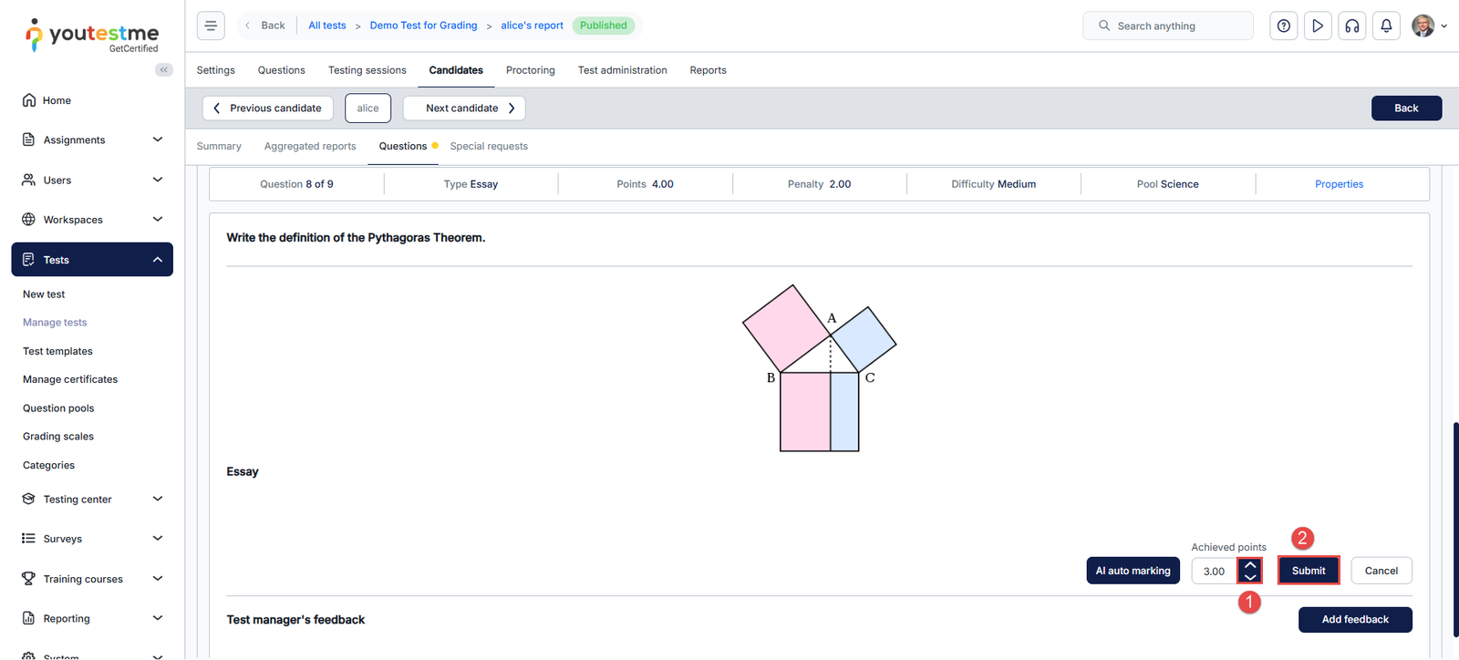 - Submit Final Grade: After reviewing the AI’s evaluation and making adjustments (if needed), click the Submit button to confirm the candidate’s final score.
